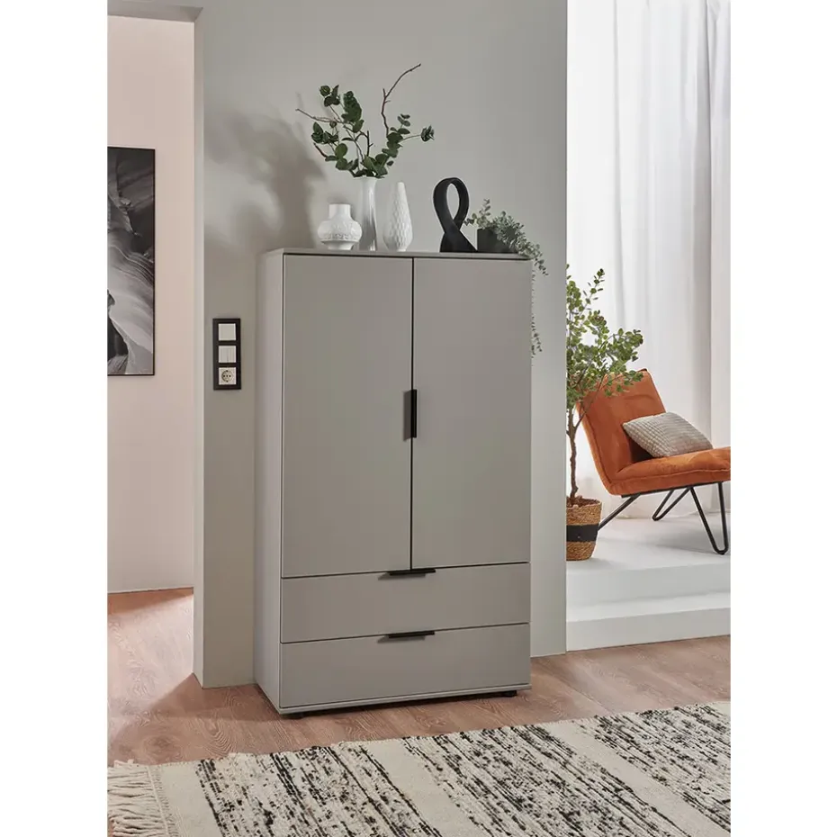 Kast Lucca 2-deurs is een praktische en compacte kast met ruime opbergmogelijkheden. De 2-deurs kast is uitgevoerd in greige kleur en heeft zowel 3 legplanken als 2 opberglades. De deur is voorzien van zwarte handvatten. De wandkast heeft een totale afmeting van 140x81x40 cm (hxbd).
