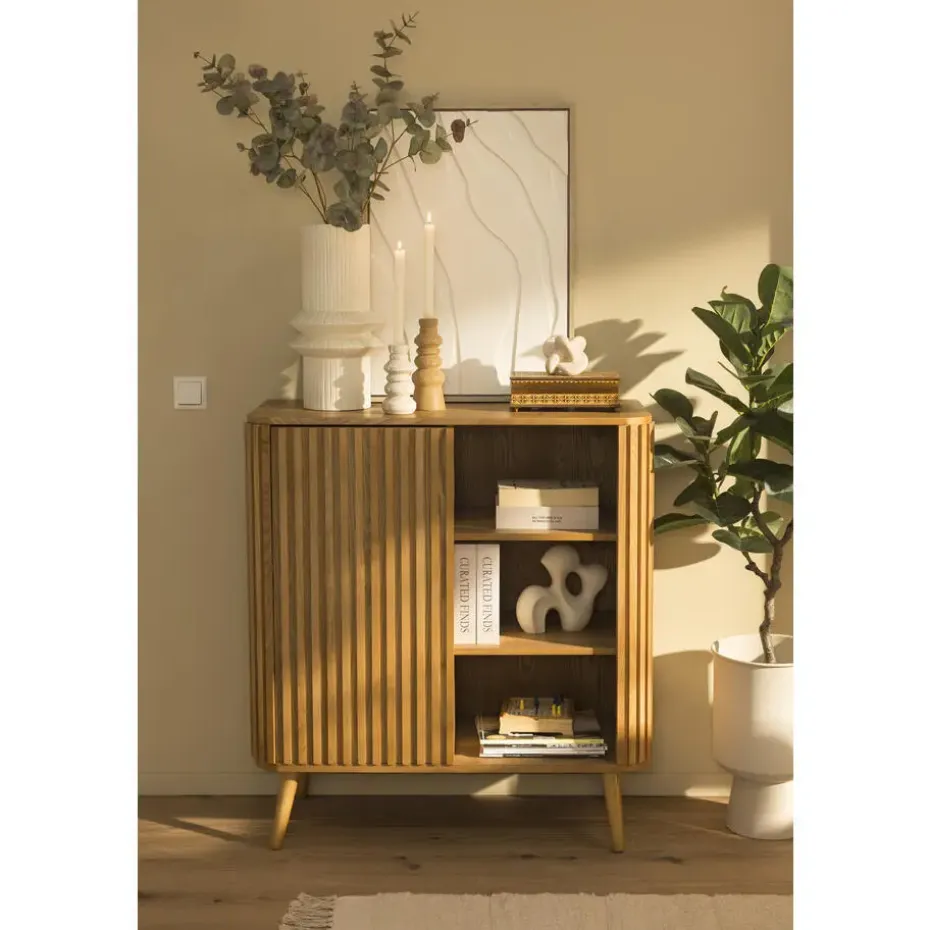 Kast Patrick is de perfecte kast om al jouw spullen in op te bergen en tegelijkertijd jouw interieur een luxe uitstraling te geven. De kast staat op houten pootjes en is gemaakt van hout met een naturelkleurige afwerking. De houten panelen met verticale lijnen geven een retro gevoel en een warme, natuurlijke uitstraling. De kast heeft een afmeting 100x90x40 (hxbxd) cm en heeft door de verschillende vakken voldoende ruimte om vanalles in op te bergen.