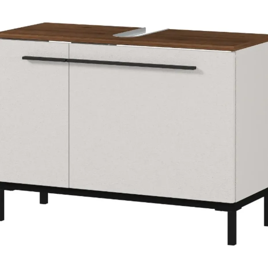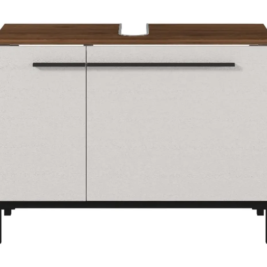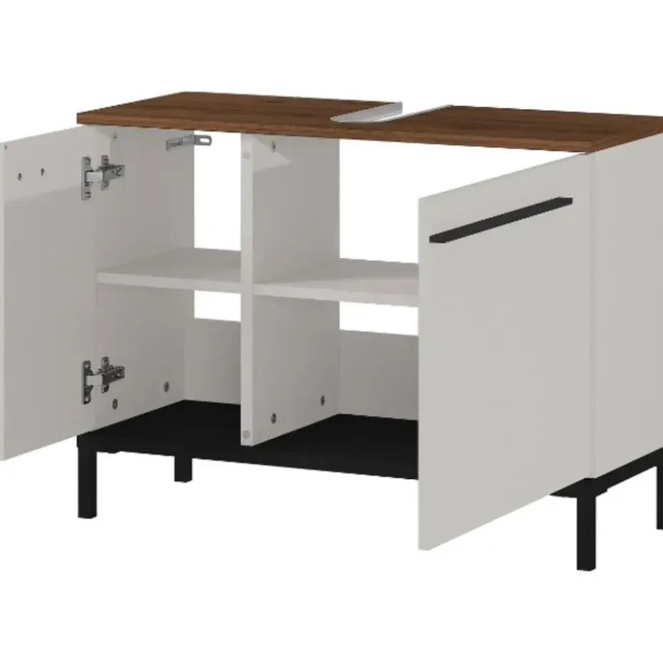 Rondslingerende handdoeken, duizend-en-een flesjes, tubes en potjes rond de wastafel … Nee, het is nog niet zo makkelijk om het overzicht in de badkamer te bewaren. Wil je voorkomen dat jouw badkamer een rommeltje wordt, bekijk dan zeker eens de Charlisa-collectie. Door de combinatie van greige en walnootlook zijn de kasten uit deze collectie ware pareltjes. Deze badkamerkast heeft 2 deuren, waarachter 2 verstelbare legplanken (max. 10 kg per plank) schuilgaan, en kan gebruikt worden om de producten die je vaak nodig hebt binnen handbereik te bewaren. De deuren sluiten dankzij de deurdempers zacht en traag. De zwarte handgrepen en poten geven de kast een moderne, elegante look. Badkamerkast Charlisa is gemaakt uit gemelamineerde spaanplaat.