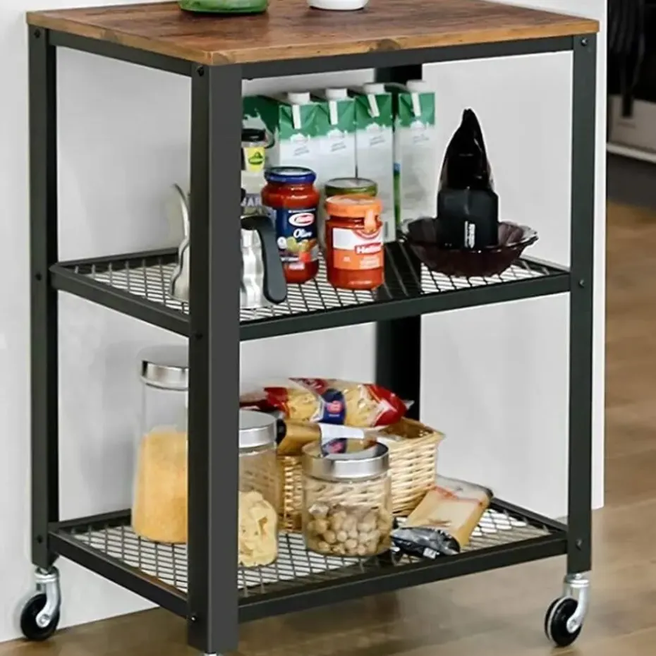 Je kookboeken en andere keukenspullen zoals de magnetron kun je netjes een plaatsje geven op deze handige opbergtrolley. De trolley is uitgerust met wieltjes, zodat je ‘m makkelijk kunt verplaatsen van de keuken naar bijvoorbeeld de woonkamer. Het karretje met legplanken is gemaakt zwart metaal en heeft een blad uit spaanplaat in rustiek bruin. Bij de levering zitten ook stelpootjes inbegrepen. Belastbaar gewicht blad: 80 kg, belastbaar gewicht legplanken: 40 kg