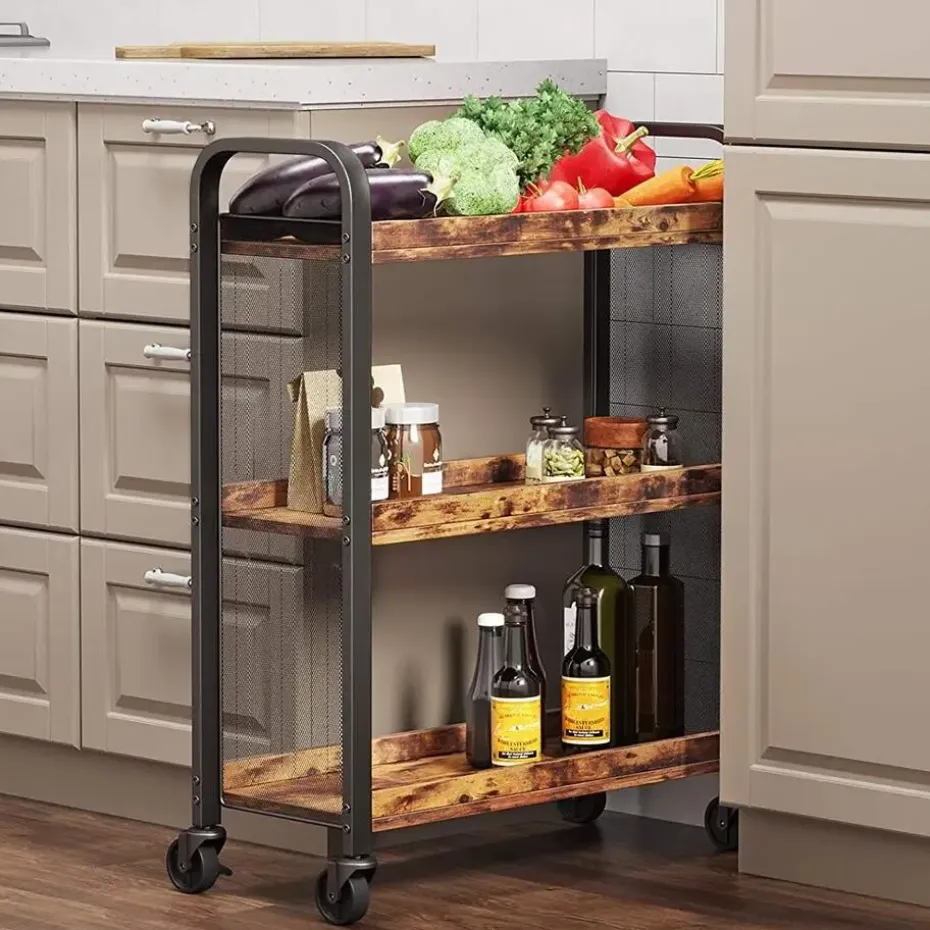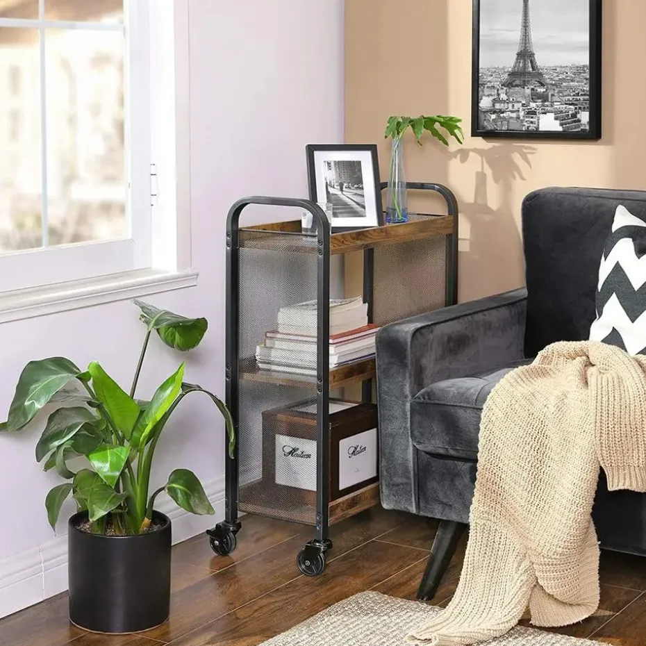 Word opnieuw verliefd op je keuken dankzij deze handige keukentrolley. De compacte, stalen trolley met 3 legplanken uit rustiek bruin spaanplaat past perfect in jouw eigentijds ingerichte keuken en bezorgt je de extra ruimte die je nodig hebt. Afhankelijk van waarvoor je het serveerwagentje wenst te gebruiken, kun je ervoor kiezen om wieltjes (2 met remmen) of stelpootjes te monteren. Belastbaar gewicht per legplank: 10 kg
