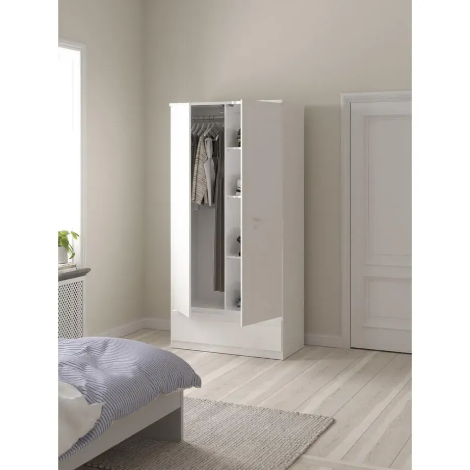 Kledingkast Naia is een 2-deurs kast met een greeploze afwerking in hoogglans wit. Het design van dit kastje bevat strakke vormen en rechte lijnen. Dit meubelstuk is gemaakt van spaanplaat.