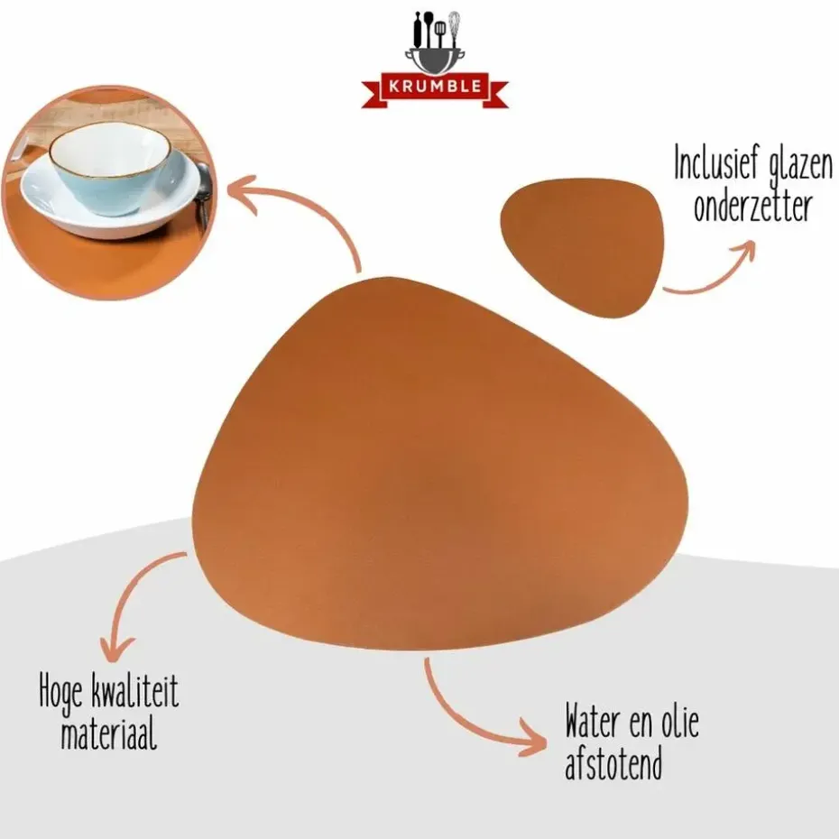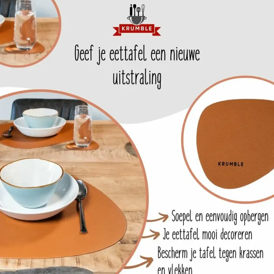 PU lederen placemats worden vaak gekozen in horeca zaken. Dit is een duidelijke reden waarom ze perfect geschikt zijn voor privé eetkamers of keukens. Het voordeel van PU leer is dat het isoleert. De Krumble placemat en onderzetter set is gemaakt met deze wetenschap. Je kunt dus perfect hete borden of warme koppen of glazen op je mooie tafel plaatsen zonder dat het schade aanbrengt. Een ander voordeel van PU leer is dat het waterdicht is. En ook dat is belangrijk op je eettafel, barmeubel of keukentafel, niet? De eettafel set van Krumble is bovendien anti-slip en dit voorkomt wegschuivend servies of glazen. PU-leder is deels een natuurlijk product en daarom ook duurzaam en milieuvriendelijk. Ook dat is mooi meegenomen.
