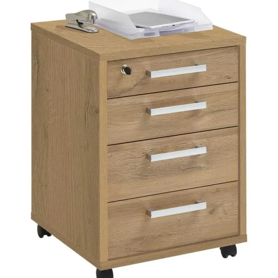 Dit stijlvolle meubeltje mag niet ontbreken in jouw kantoor! Ladeblok Gabi is vervaardigd uit spaanplaat en heeft een decor van oude eik. Het kastje telt 4 handige lades waarin je allerlei kantoorartikelen kan opbergen. Dankzij de wielen kan je het bovendien makkelijk verplaatsen. Je kan het ladeblok combineren met de bijpassende kantoormeubelen van de collectie Gabi, maar dankzij zijn neutrale look past het ook goed bij andere meubelen.