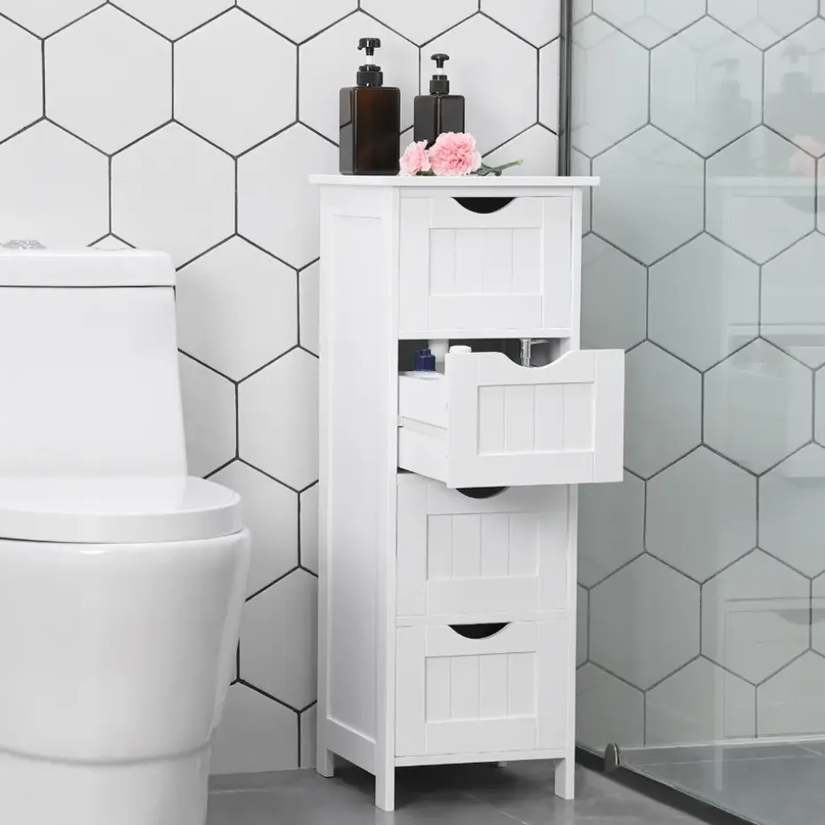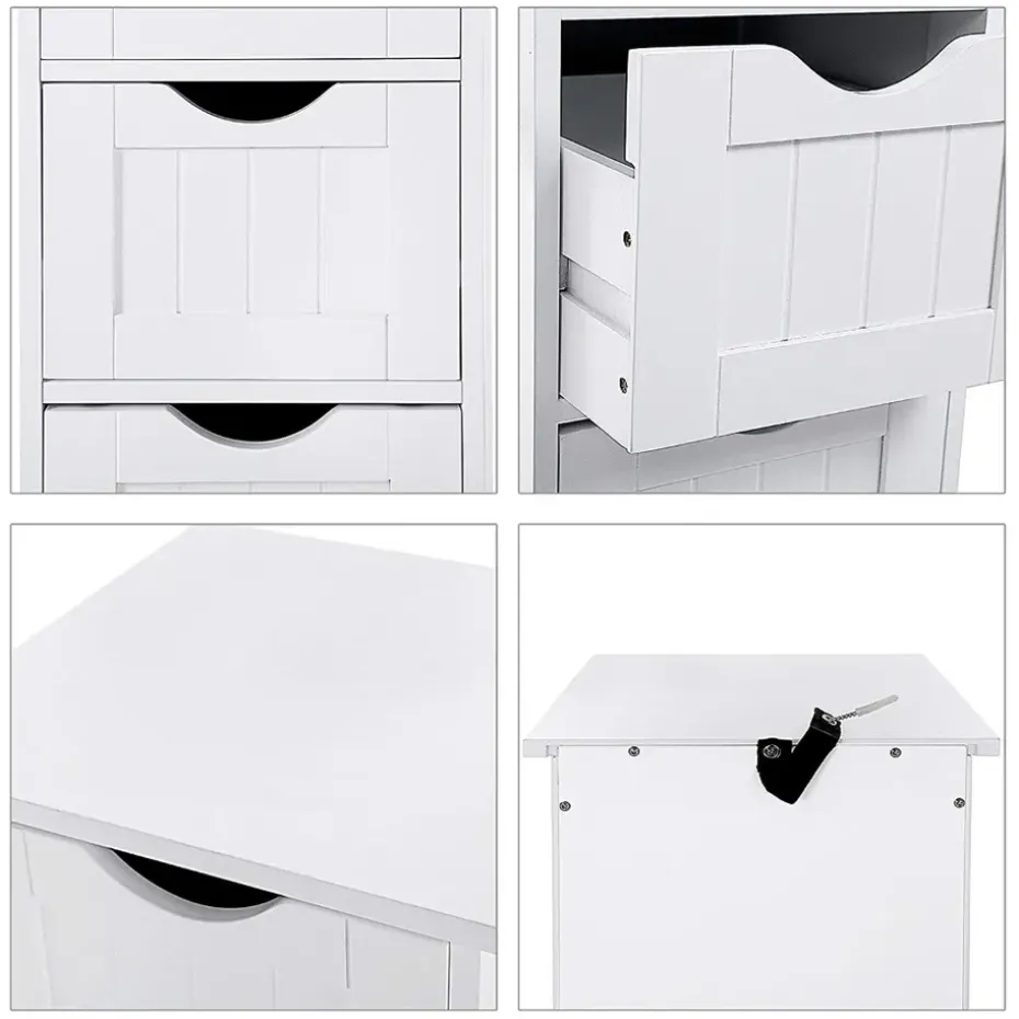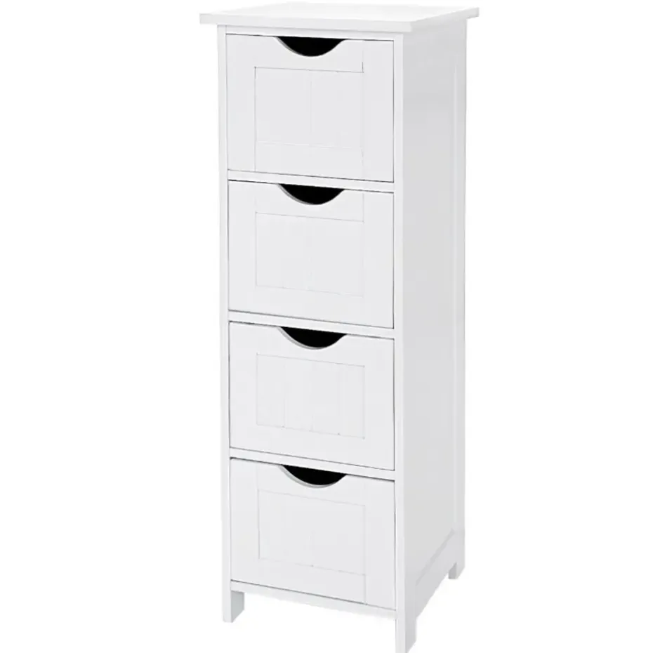 Deze zeer praktische ladekast zal perfect een plaatsje vinden in jouw badkamer. Met vier ruime vakken is er alvast aan opbergruimte zeker geen gebrek. Ook het bovenblad kan je praktisch benutten door er decoratie op te zetten. En dat is nog niet alles! Door een speciaal ontwerp kunnen de opberglades er bij het openen niet uitvallen. Super handig, niet? Het glanzende oppervlak is te danken aan een vernislaag die het meubel bovendien ook vochtbestendig maakt.