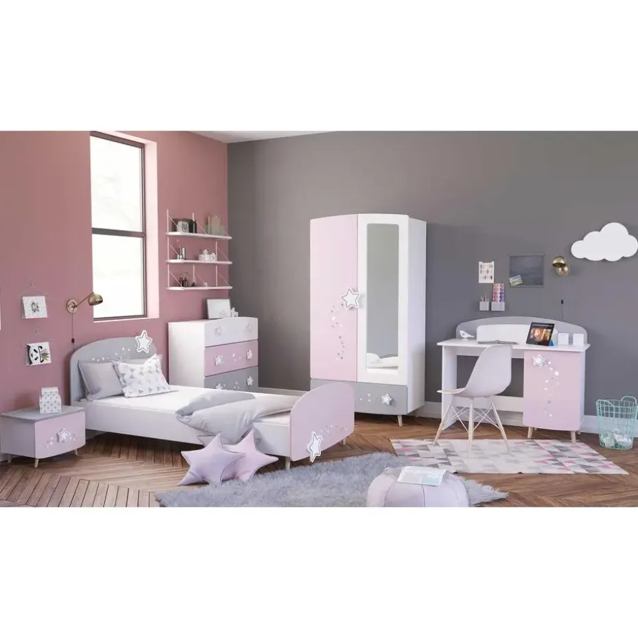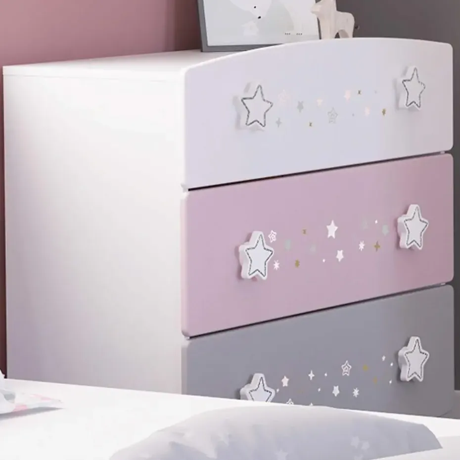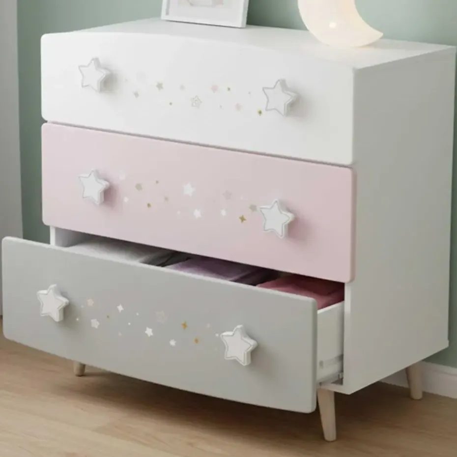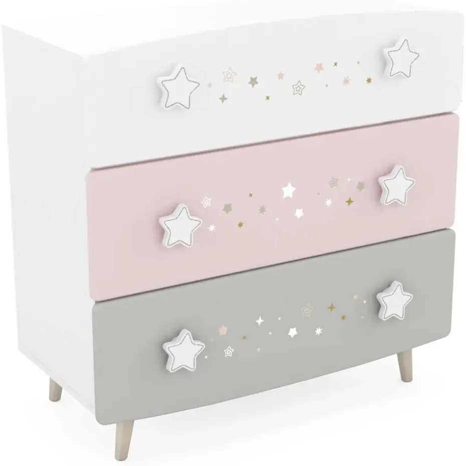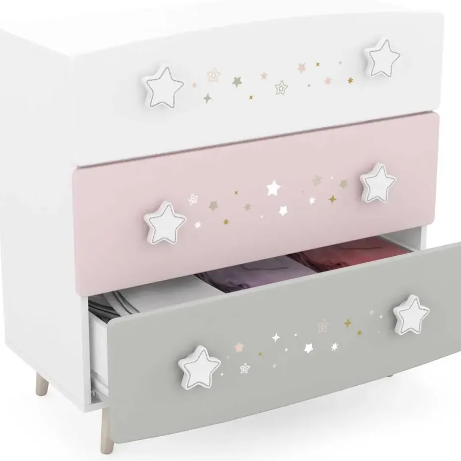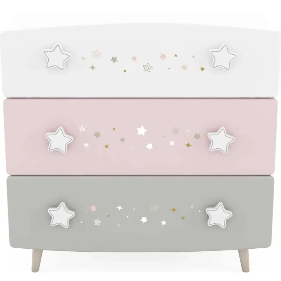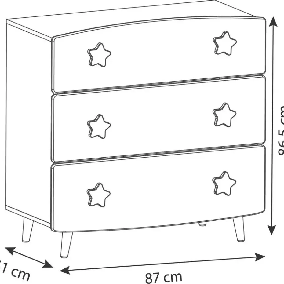 Met de Stellar-collectie droomt uw kind zo weg tussen de sterren! De leuke stervormige handgrepen en decoratieve sterretjes vormen samen met de lichte pastelkleuren een magische combinatie. De afwerking in milieuvriendelijke verf op waterbasis en de afgeronde hoeken maken deze collectie kindveilig. Deze ladekast biedt met zijn 3 lades ruim voldoende opbergruimte voor kousen, ondergoed en beddengoed. Combineer met de andere meubels van de Stellar-collectie en verras uw kind met de kamer van zijn/haar dromen! Vijzen en pluggen voor wandmontage zijn niet inbegrepen.