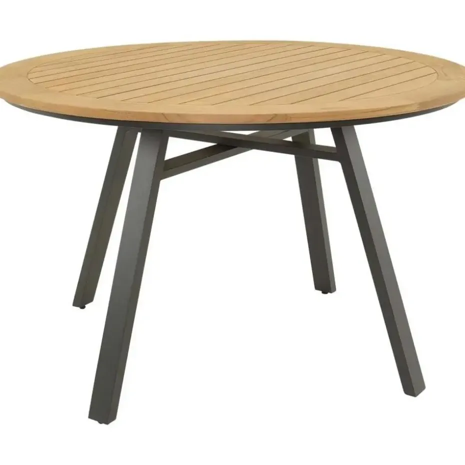 De Monza antraciet tafel van Lesli heeft een elegant design met een naturel houten tafelblad en een stoer antraciet frame. Met een diameter van 120 cm biedt de tafel voldoende ruimte voor gezellige maaltijden en buitenbijeenkomsten. De combinatie van de natuurlijke kleur en het moderne frame maakt deze tafel een perfecte aanvulling voor je tuin of terras.