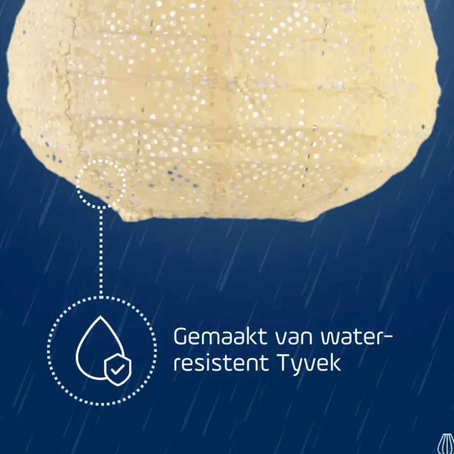 De solar module is uitgevoerd in een bij het Tyvek passende kleur en geeft een warme kleur LED licht. Ons doel om een duurzame LUMIZ LED lampion te ontwikkelen met mooie materialen, heeft ons geleid naar het sterke, weerbestendige en 100% recyclebare Tyvek. Tyvek is een synthetisch materiaal dat bestaat uit vezels van HDPE (hoge-dichtheid-polyetheen): Een zeer hoogwaardig materiaal om u lang te laten genieten van de LUMIZ.