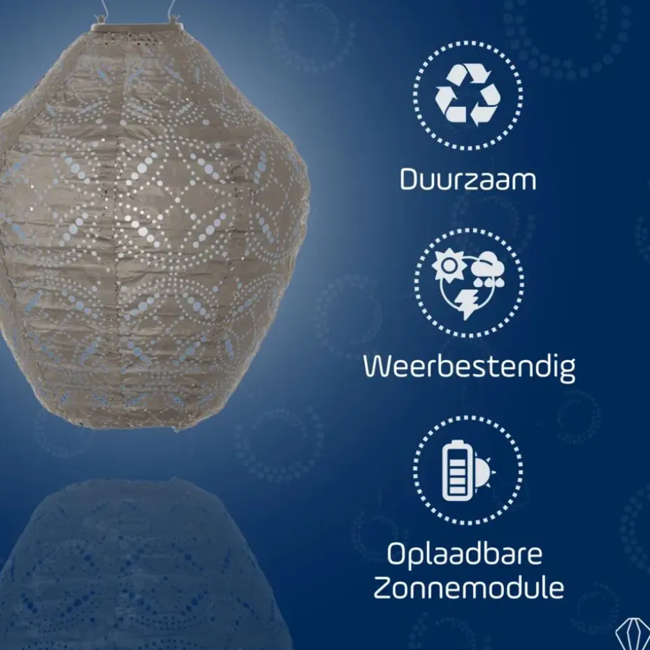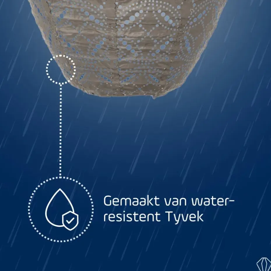 De Lumiz Solar Buitenlamp is ontworpen met zowel esthetiek als duurzaamheid in gedachten. De lampion is gemaakt van Tyvek, een sterk, weerbestendig en 100% recyclebaar materiaal dat lang meegaat. Bovendien geeft de lampion een warm LED licht dat perfect is voor het creëren van een gezellige en sfeervolle ambiance in jouw tuin.