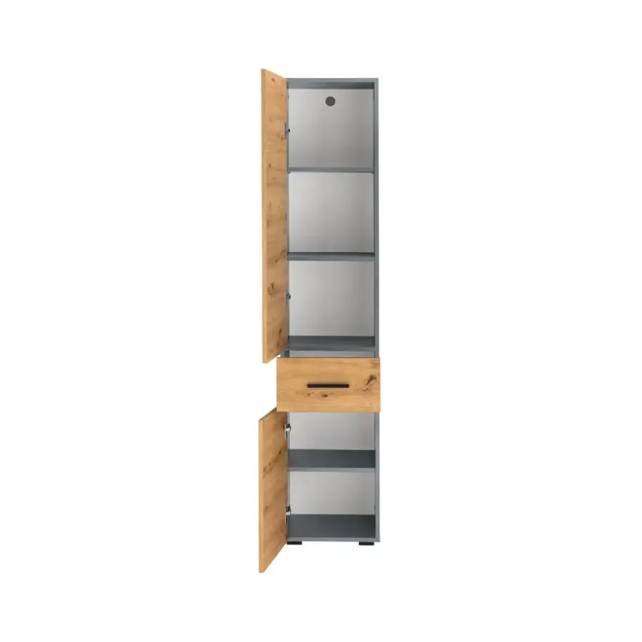 Je kunt de midikast met veel opbergruimte gebruiken in de badkamer, in de gang of in de bijkeuken. De kast is gemaakt van een houtmateriaal uit een FSC®-gecertificeerde productie. Dankzij de onderhoudsvriendelijke oppervlakken kan de midikast met veel opbergruimte moeiteloos schoon worden gehouden.