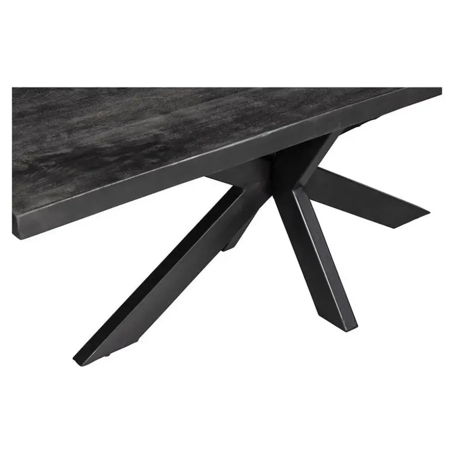 Het bladis eerst gezandstraald, waarna het behandeld wordt met zwarte verfbeits en tenslotte afgewerkt wordt met een donkere, natuurlijke bijenwas om het hout te beschermen tegen vocht, vuiligheid en kringen. Over de metalen spinpoot is een zwarte poedercoat aangebracht, wat zorgt voor een robuust uiterlijk.