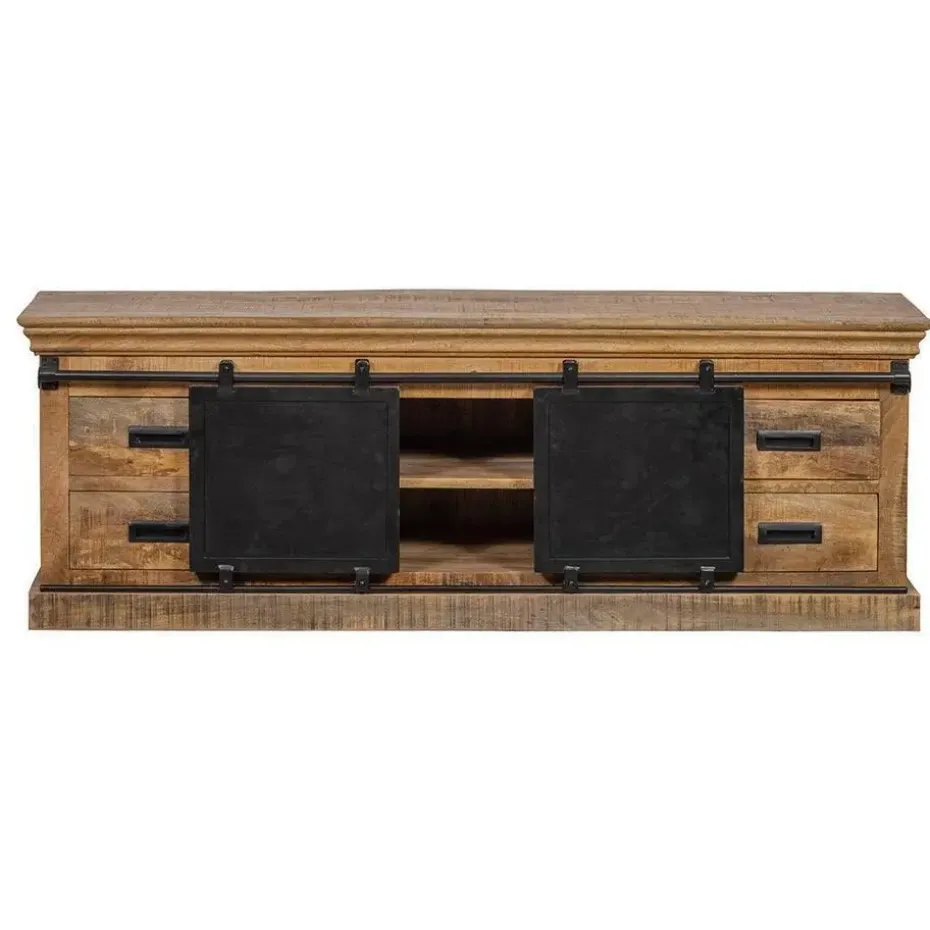 Over het massieve mangohout worden meerdere lagen houtolie en een blanke, natuurlijke bijenwas aangebracht om het hout te beschermen tegen vocht, vuiligheid en kringen. De schuifdeuren, de handgrepen en de rails zijn gemaakt van zwart gepoedercoat metaal.