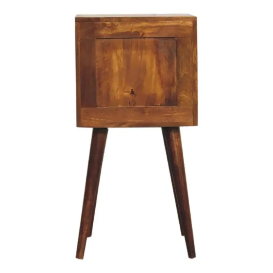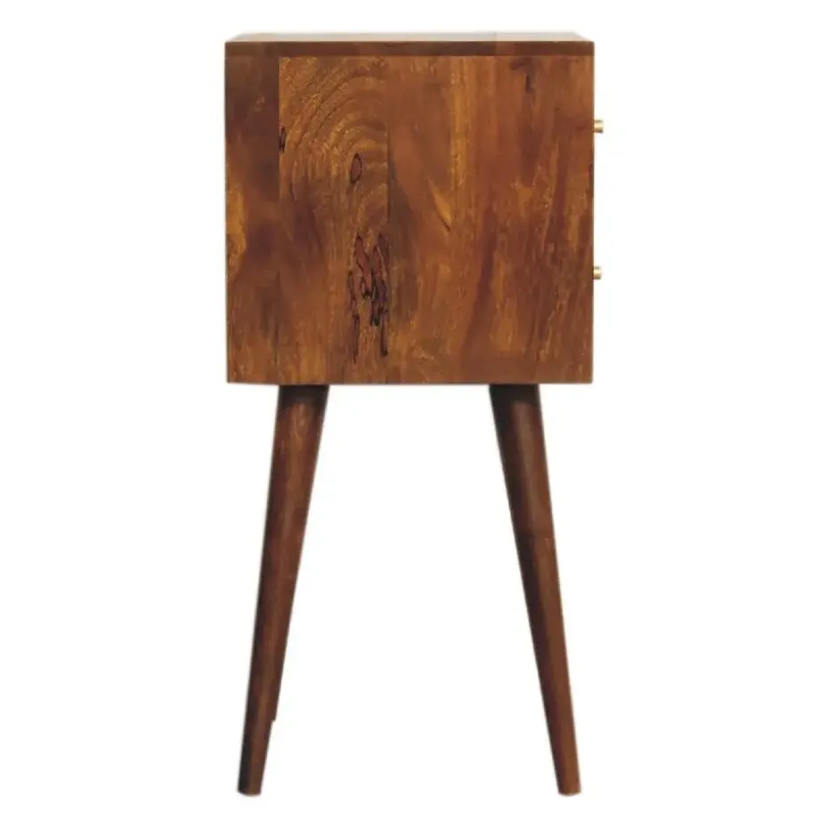 Dit prachtig ontworpen nachtkastje is gemaakt van 100% massief mangohout en heeft een fijne kastanjebruine afwerking. Het beschikt over 2 kleine kubusvormige lades die het stuk extra karakter en dimensie geven. Het heeft 4 Scandinavische stijl poten om uw huis te moderniseren en kan in krappe ruimtes worden geplaatst, geschikt voor elk type interieur. Dit petite product is onderdeel van de Recession Collection.