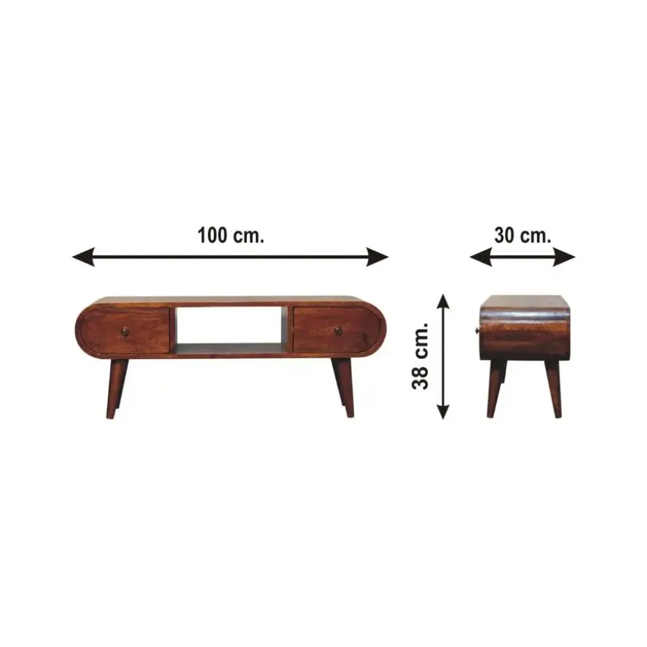 Onze massieve houten mediastand is vakkundig gemaakt van 100% massief mangohout in een mooie kastanjebruine afwerking. Dit moderne ronde ontwerp biedt schone, gebogen hoeken en beschikt over 2 kleine lades met een glanzende knop, en een open slot om boeken, fotolijsten, ornamenten te plaatsen, evenals 4 Scandinavische stijl poten.