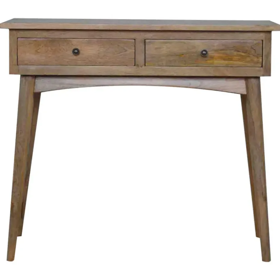 Een eenvoudige en elegante charme is precies wat deze praktische console-tafel biedt. Het past in de meeste interieurs en is gemaakt van 100% massief mangohout, met duurzaam verkregen hout, in Scandinavisch ontwerp. De tafel heeft twee lades die je helpen je huis georganiseerd te houden en kleine huishoudelijke voorwerpen op te bergen. Het heeft glanzende knoppen en een fijne eiken afwerking.
