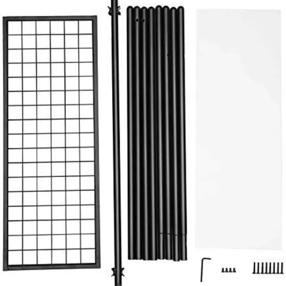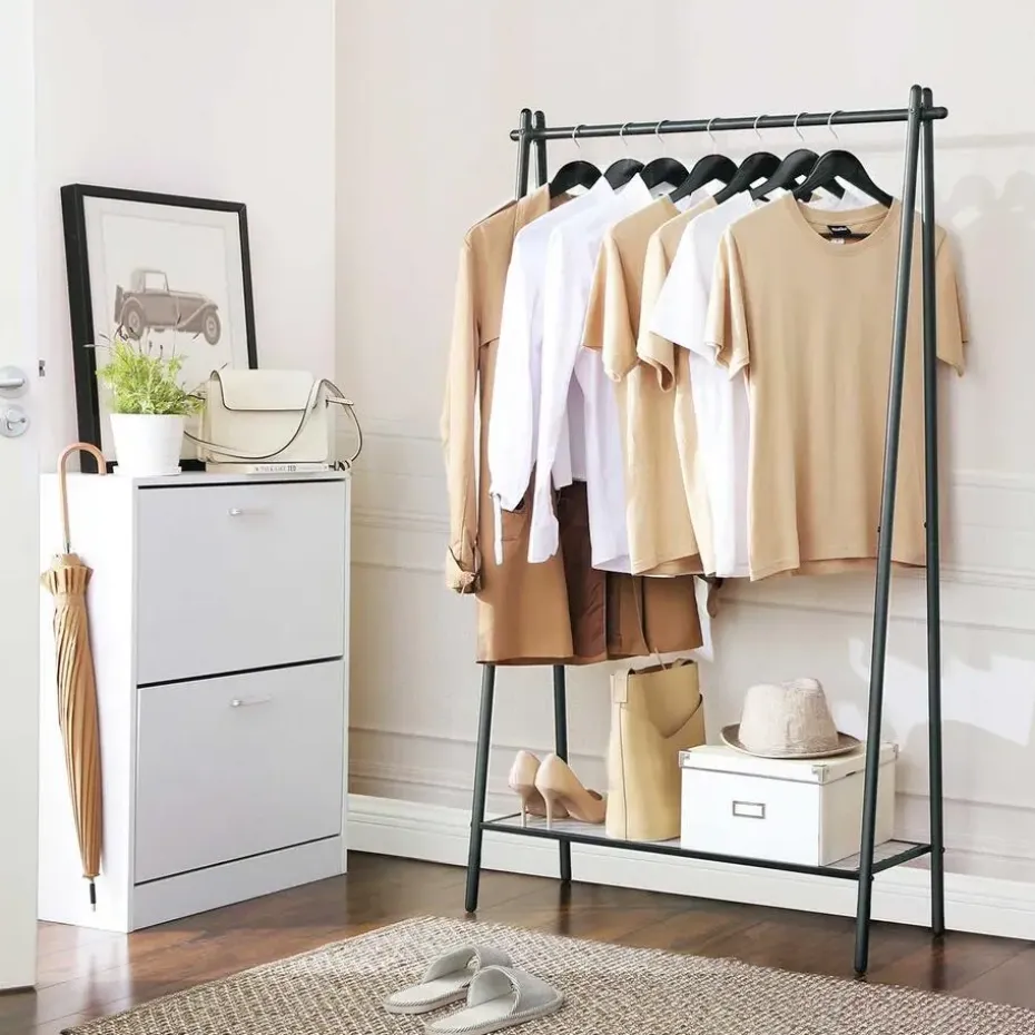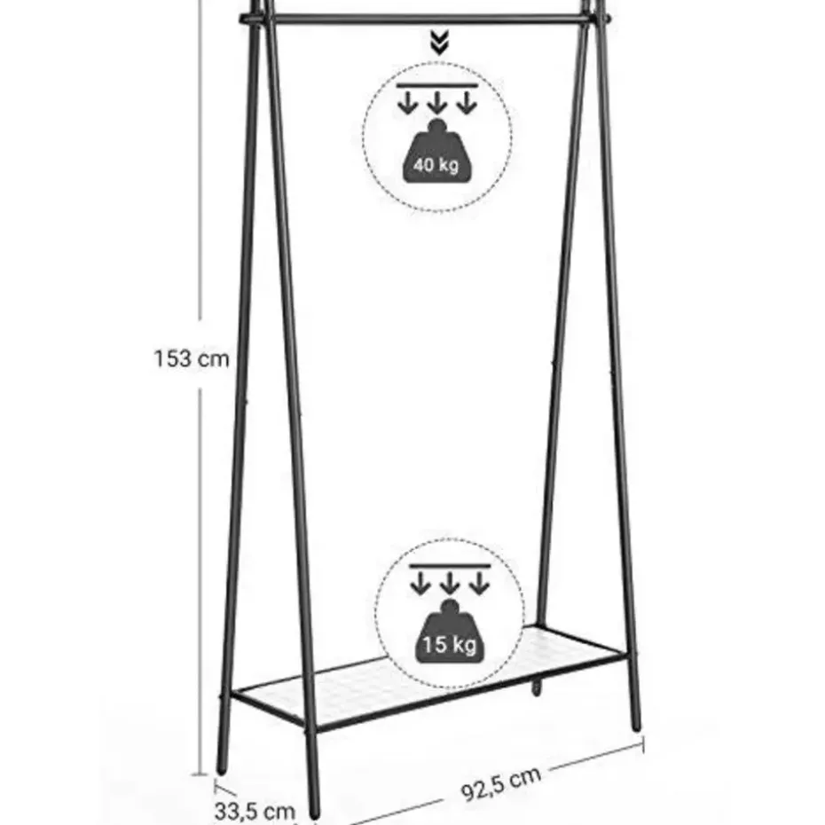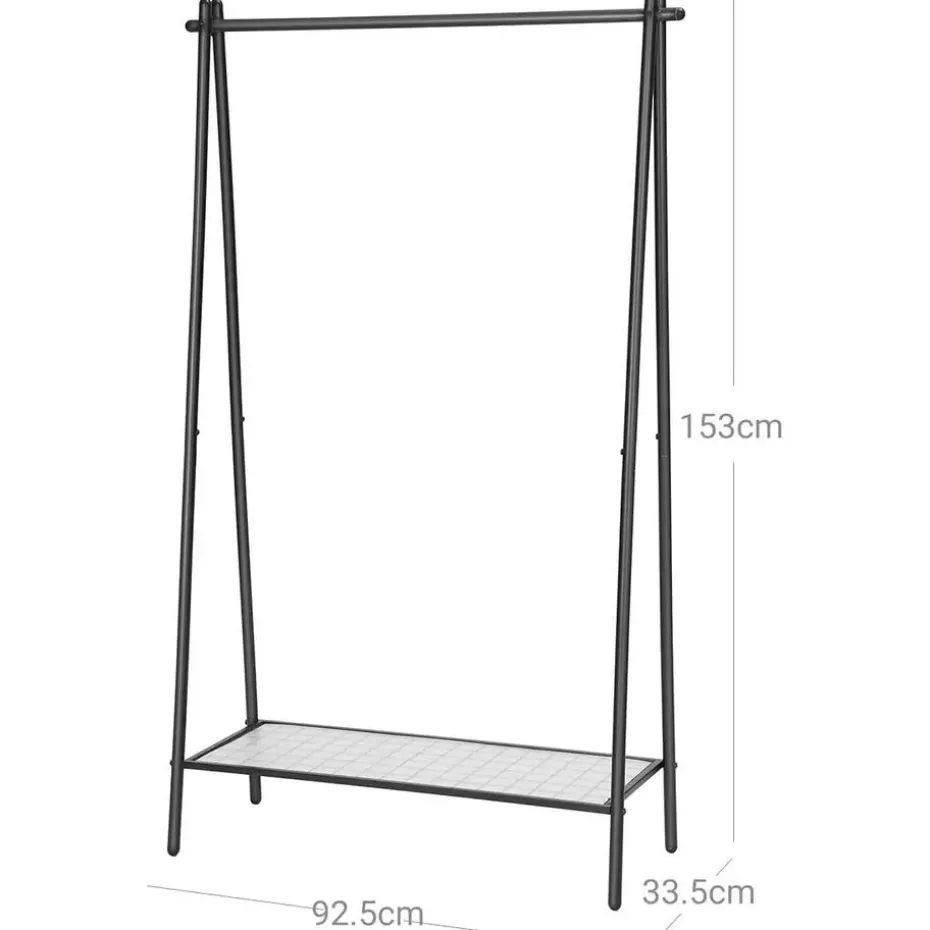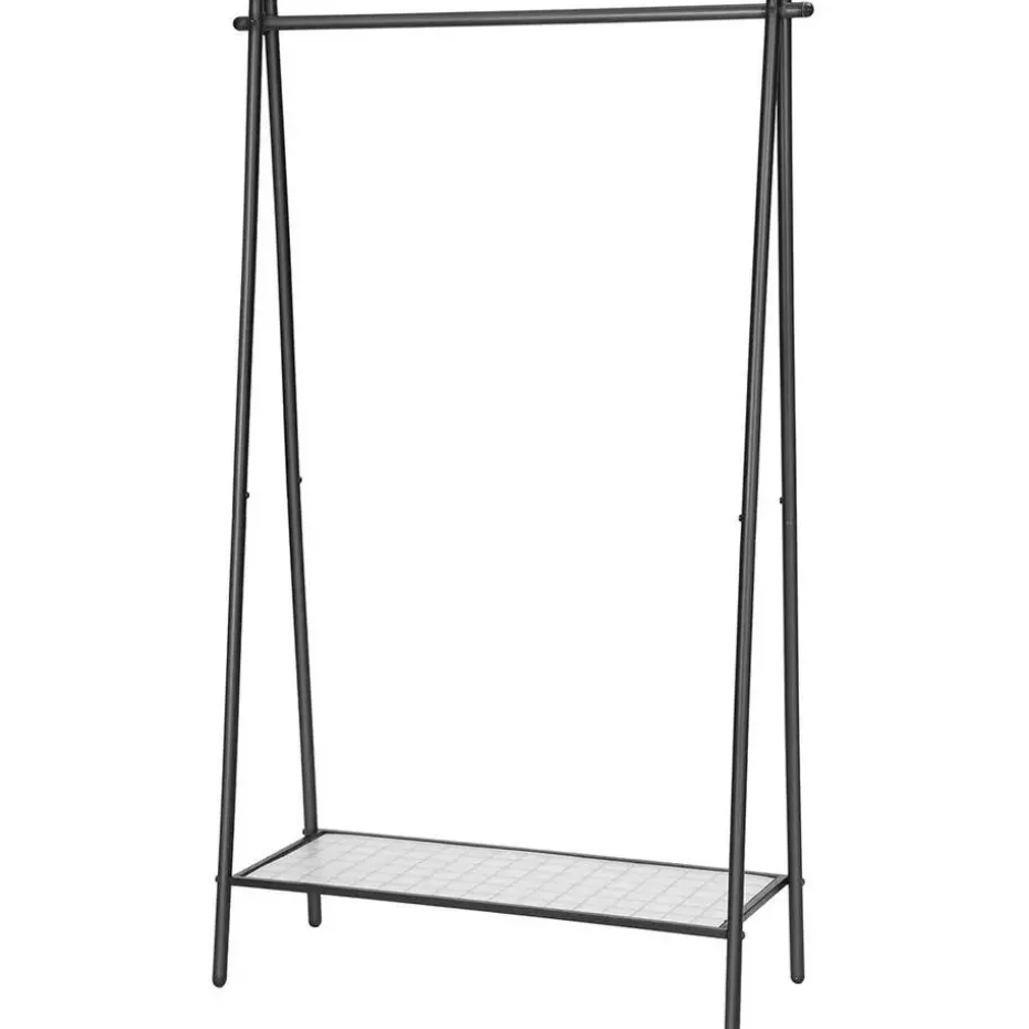 BELANGRIJKSTE KENMERKEN EN VOORDELEN: Deze stijlvolle kapstok met zijn matzwarte afwerking en ruime ontwerp biedt praktische opbergruimte in elke kamer en helpt een elegante en serene sfeer te creëren. Het stevige stalen frame heeft een ophangrail met een draagvermogen tot 40 kg en een gaasbodemplank met een draagvermogen tot 15 kg. Het meegeleverde kunststof paneel zorgt ervoor dat zelfs de kleinste voorwerpen niet van de plank vallen. Montage is super eenvoudig dankzij de geïllustreerde instructies en genummerde onderdelen. Geniet van praktische opslag en een verzorgde stijl met deze aantrekkelijke kapstok