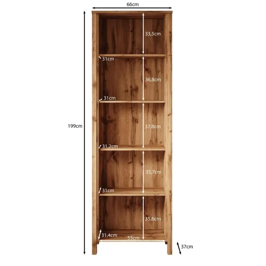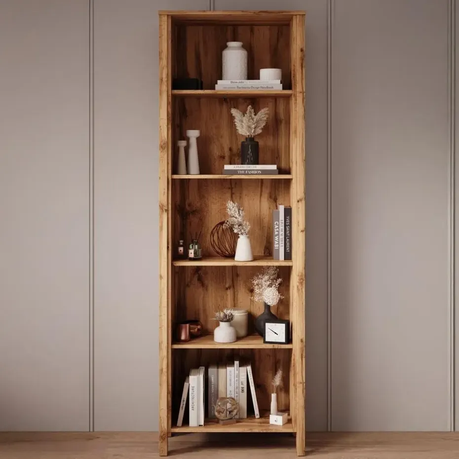 Boekenkast Isaac is uitgevoerd in een moderne, landelijke stijl, volledig in de kleur eiken. De kast beschikt over 5 open vakken. Het meubel wordt ongemonteerd geleverd. Je dient het dus met behulp van de bijgeleverde handleiding zelf in elkaar te zetten.