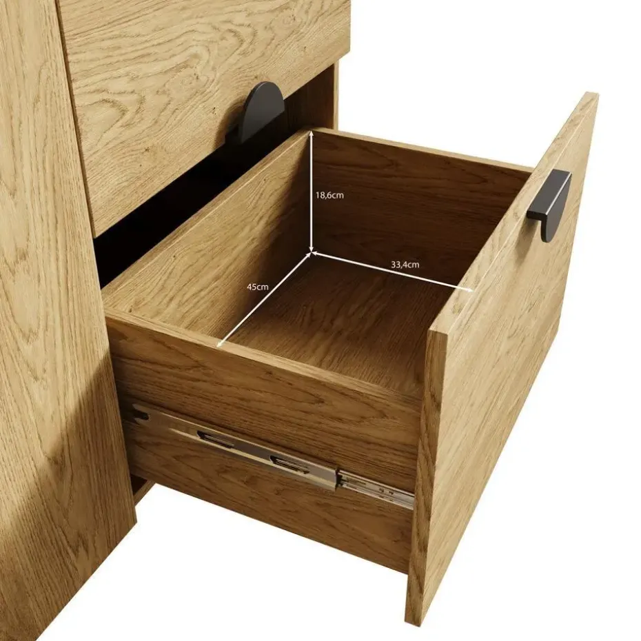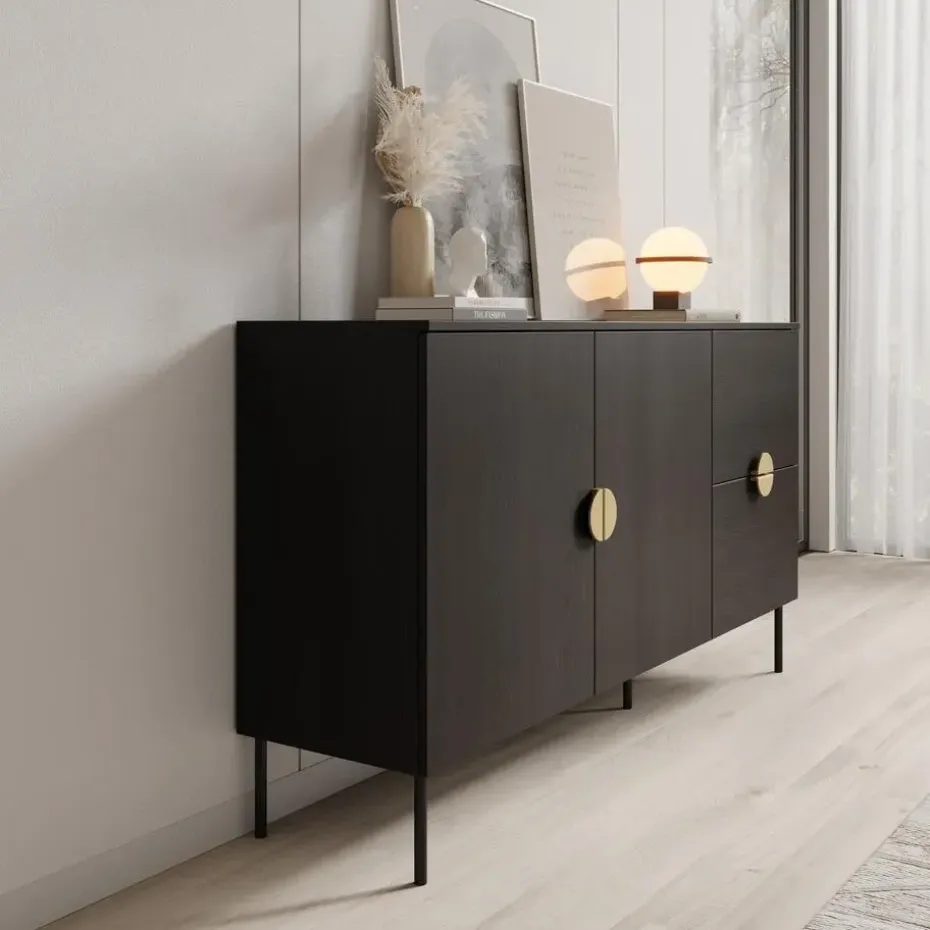 Dressoir Monor beschikt over 2 deuren waarachter 2 opbergvakken zitten. Hiernaast zitten nog 2 lades. De deuren en lades openen met goudkleurige handgrepen. Het meubel is uitgevoerd in de kleur zwart eiken en staat op metalen poten. Het meubel wordt ongemonteerd geleverd. Je dient het dus met behulp van de bijgeleverde handleiding zelf in elkaar te zetten.
