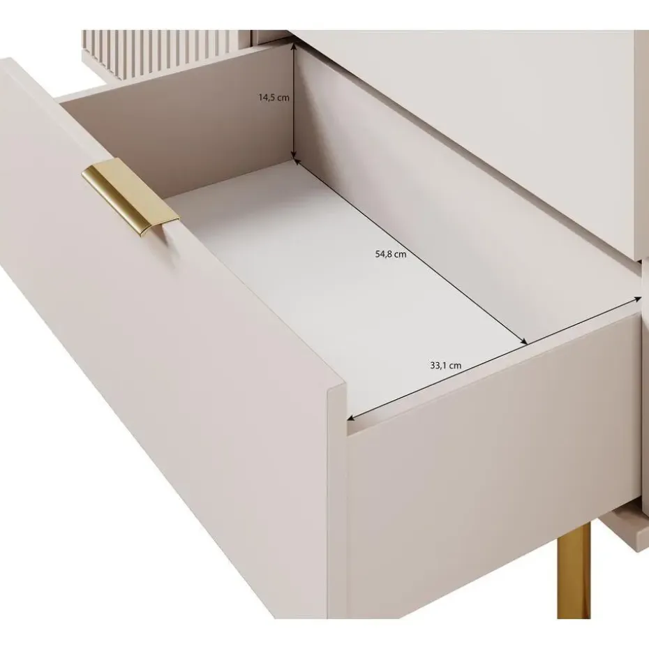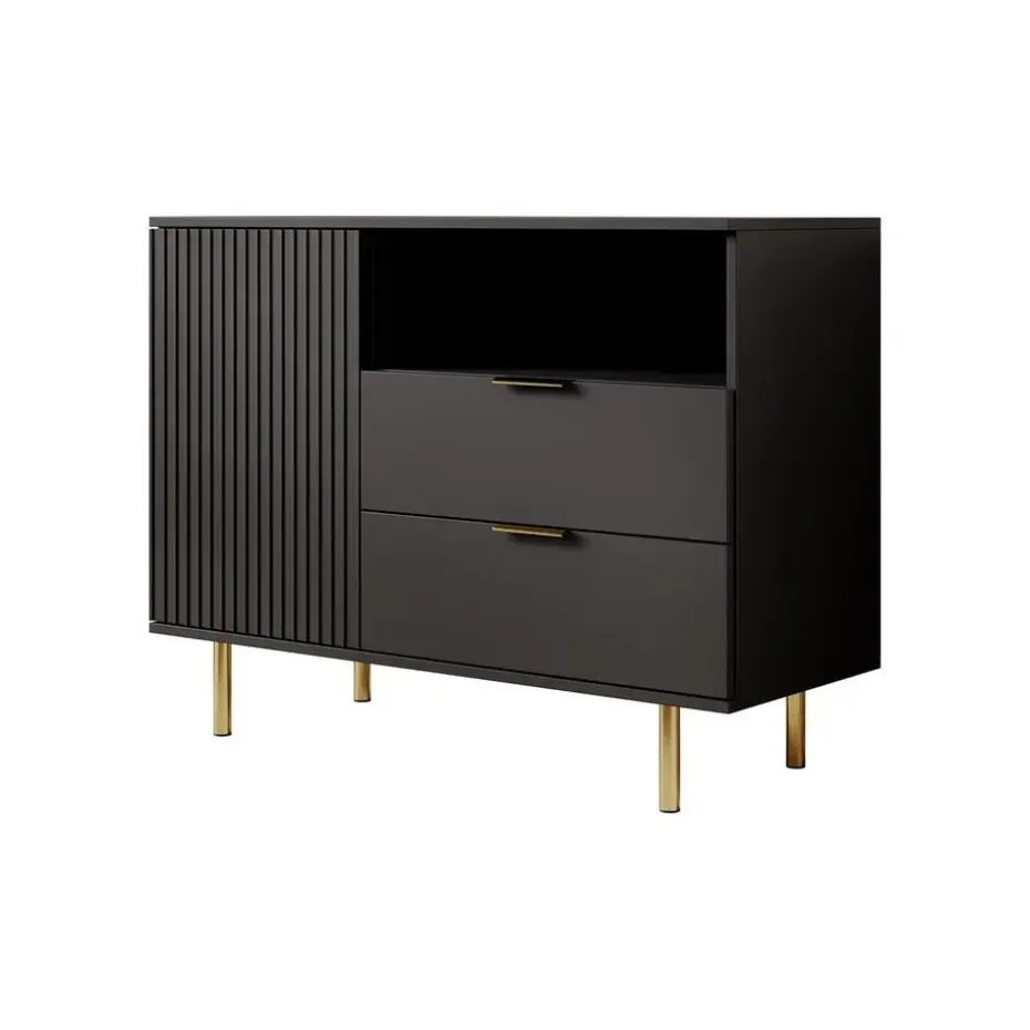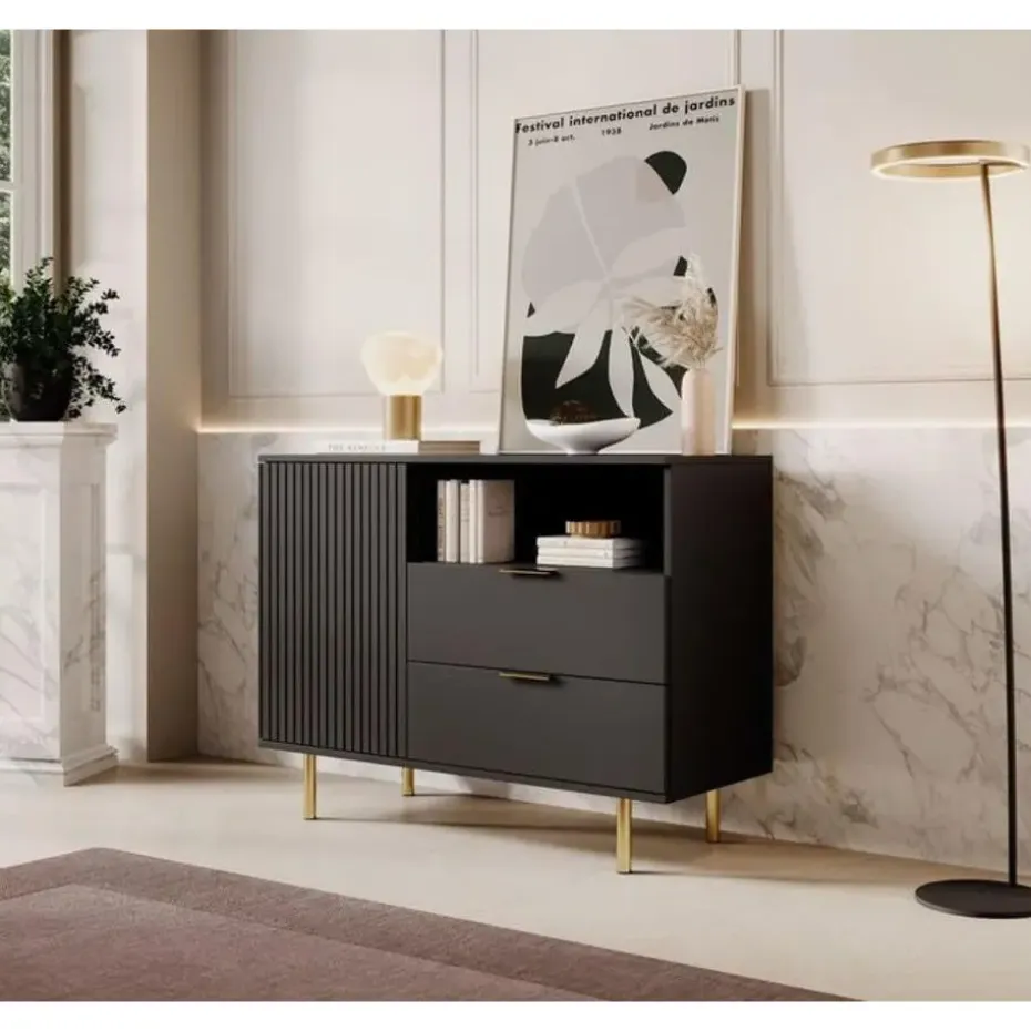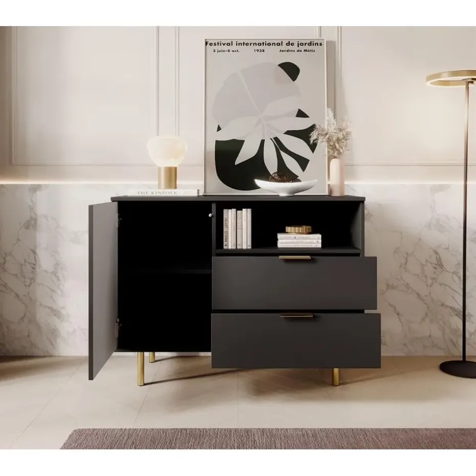 Dressoir Nicola is gemaakt in een mat zwarte kleur. De opbergkast beschikt over 1 deur en 2 lades. Deze openen met goudkleurige handgrepen. Achter de deur zitten 2 opbergvakken. Het dressoir staat op hoge pootjes. Het meubel wordt ongemonteerd geleverd. Je dient het dus met behulp van de bijgeleverde handleiding zelf in elkaar te zetten.