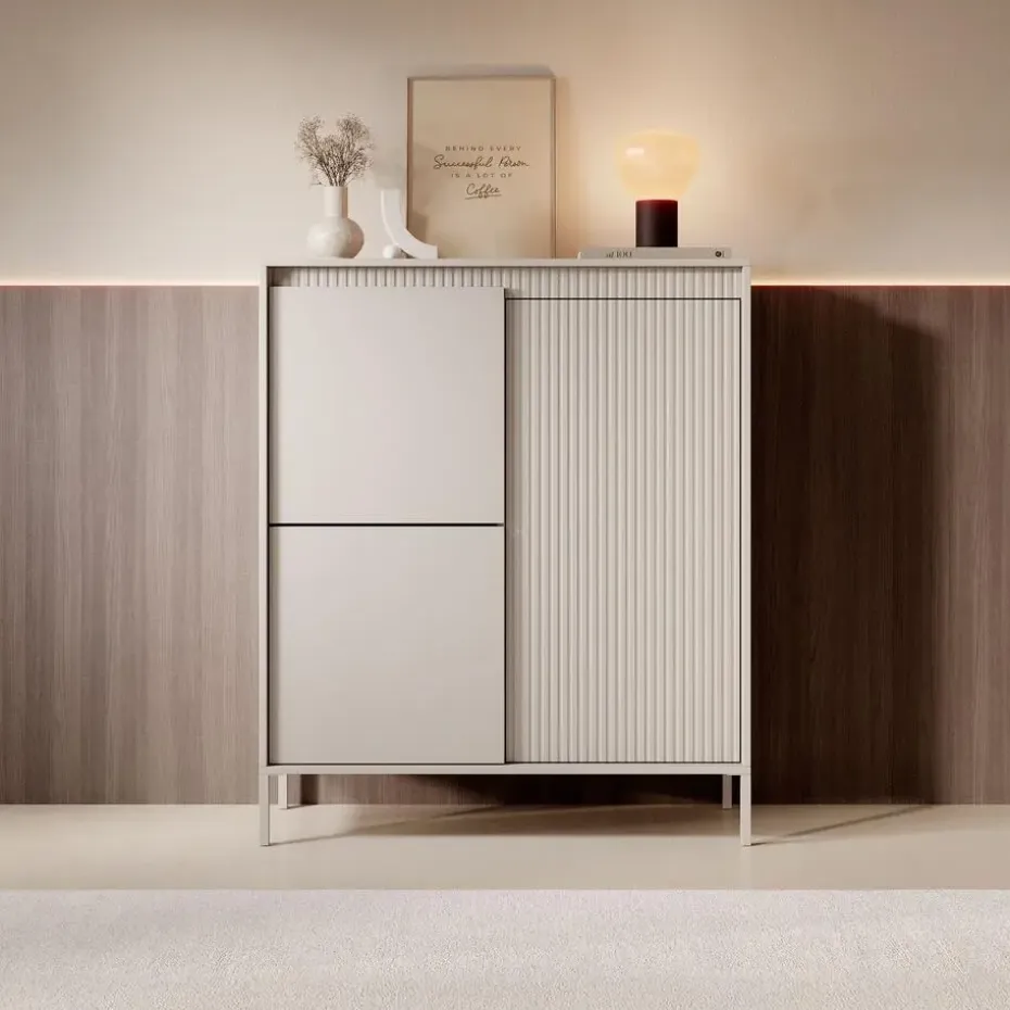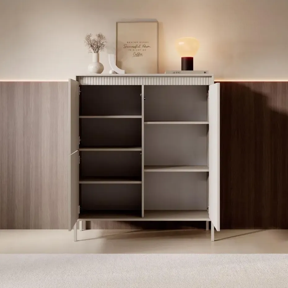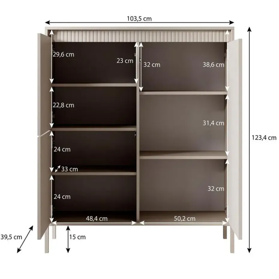 Dressoir Saran is gemaakt in een beige kleur. De opbergkast beschikt over 3 greeploze deuren. Achter de deuren zitten 7 opbergvakken. Het dressoir staat op hoge, beige pootjes. Het meubel wordt ongemonteerd geleverd. Je dient het dus met behulp van de bijgeleverde handleiding zelf in elkaar te zetten.
