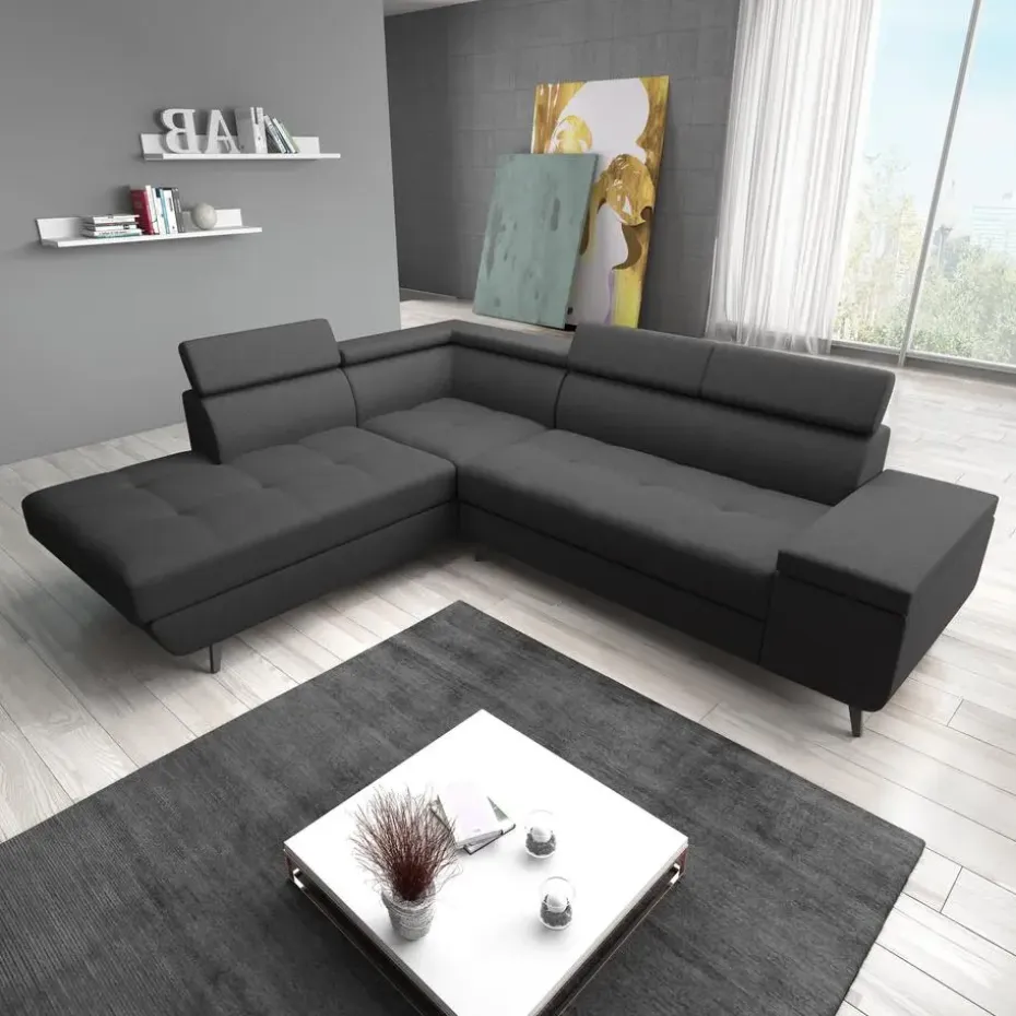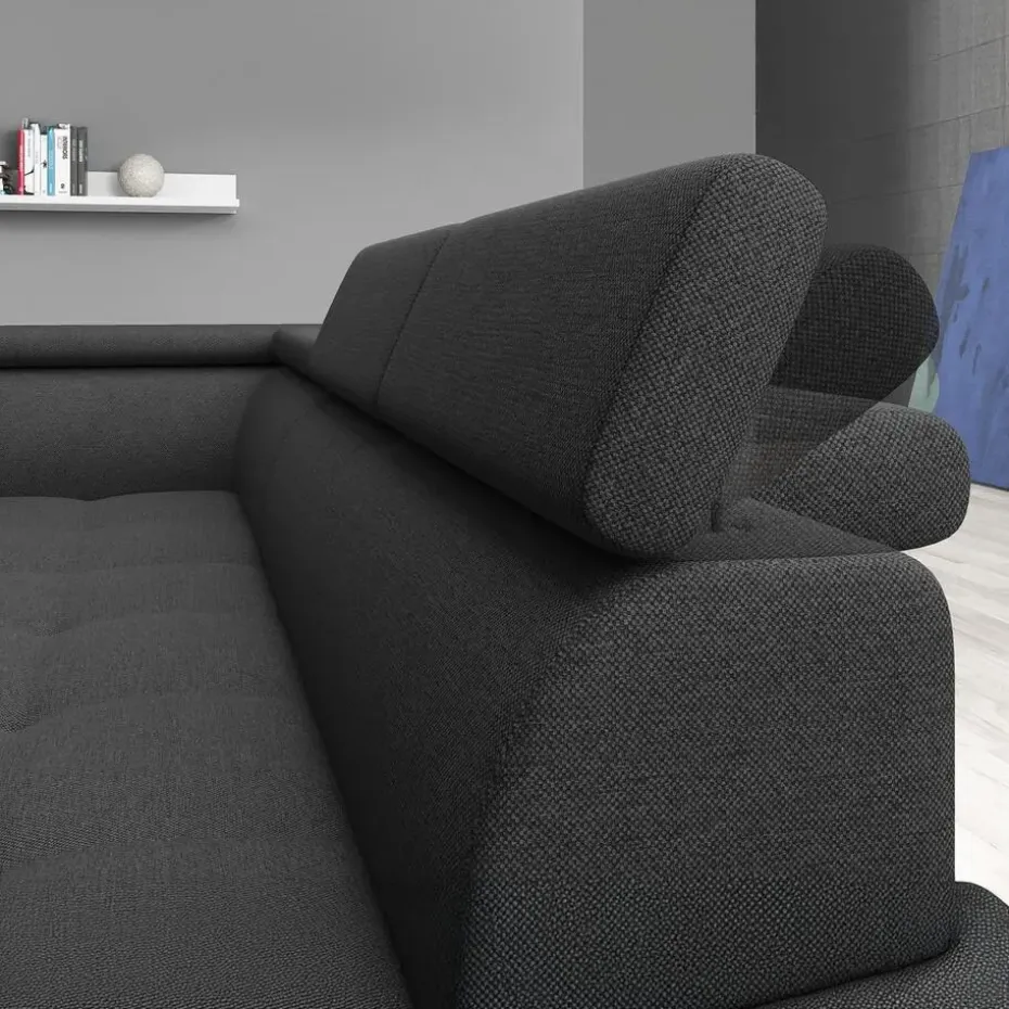 Hoekbank Destiny is gemaakt van stof in zwarte kleur. De Destiny is een L-vormige hoekbank. Staat op zwarte poten. De bank heeft vaste zit- en rugkussens. De hoofdsteunen zijn verstelbaar voor extra comfort. Het meubel wordt ongemonteerd geleverd. Je dient het dus met behulp van de bijgeleverde handleiding zelf in elkaar te zetten.