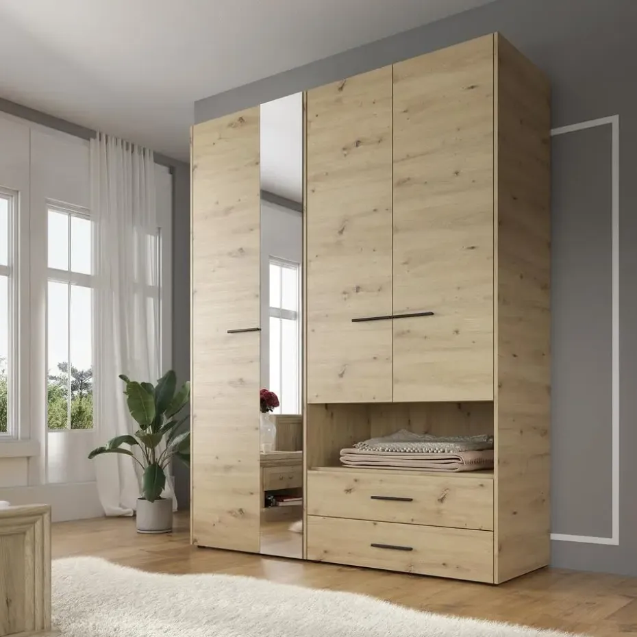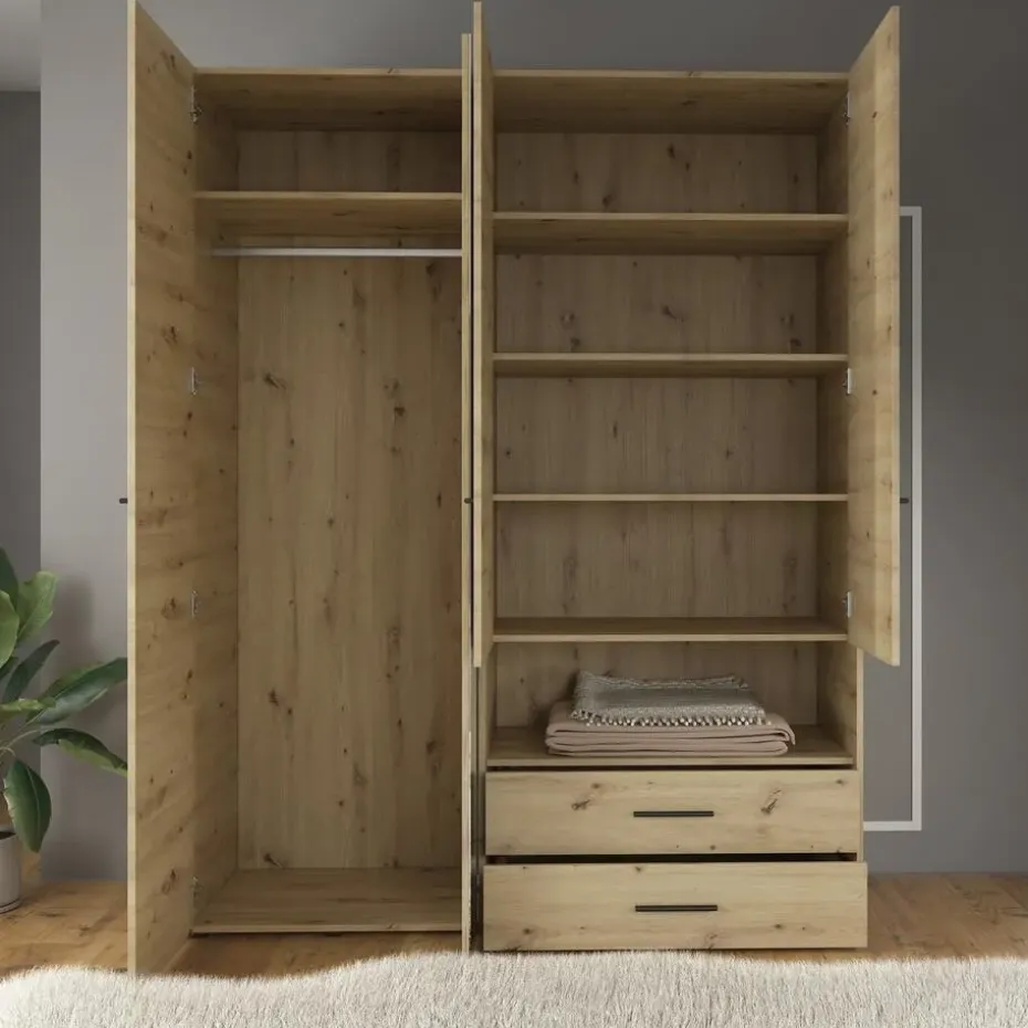 Kledingkast Laura beschikt over 4 scharnierdeuren. Op één deur is een handige spiegel geplaatst. De binnenkant bestaat uit 1 kledingroede en 6 open vakken. Ten slotte heeft het meubel ook nog 2 lades. Het meubel wordt ongemonteerd geleverd. Je dient het dus met behulp van de bijgeleverde handleiding zelf in elkaar te zetten.