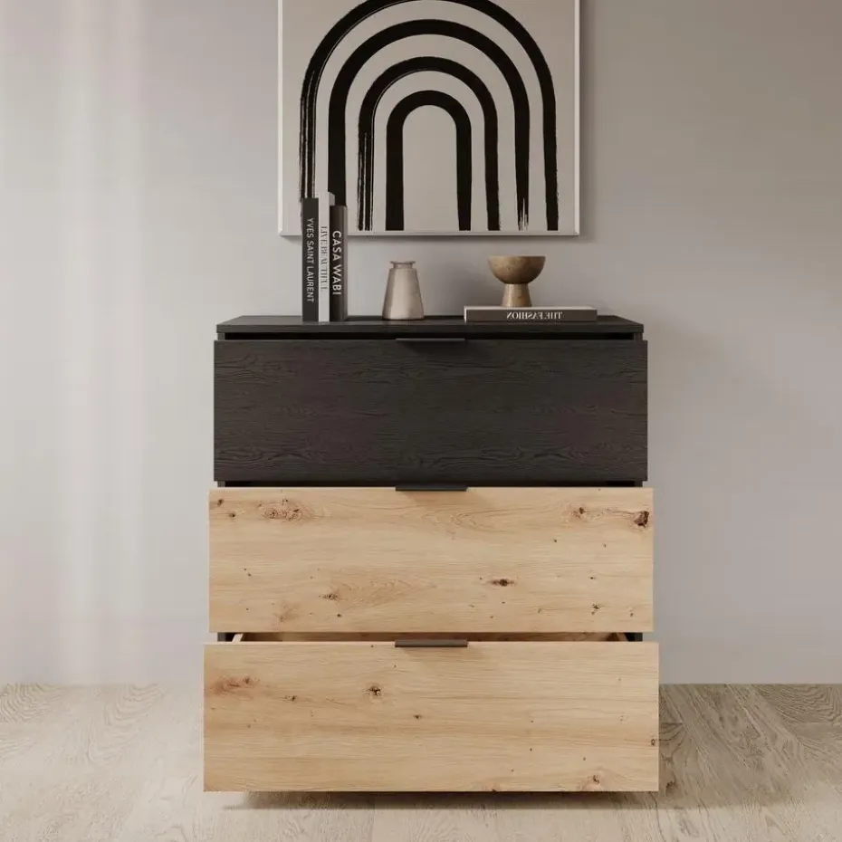 Ladekast Augustus is gemaakt in eiken met zwart eiken kleur. De kast beschikt over 3 lades die openen met zwarte handgrepen. De Augustus past goed in industriële of moderne interieurs. Het meubel wordt ongemonteerd geleverd. Je dient het dus met behulp van de bijgeleverde handleiding zelf in elkaar te zetten.