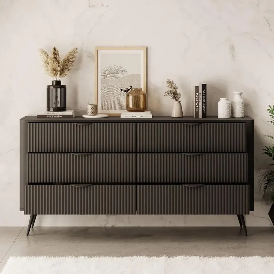 Ladekast Lima is gemaakt in een zwarte kleur. De opbergkast beschikt over 6 lades die openen met zwarte handgrepen. De voorkant van de lades hebben een latten patroon. De Lima staat op metalen poten. Het meubel wordt ongemonteerd geleverd. Je dient het dus met behulp van de bijgeleverde handleiding zelf in elkaar te zetten.