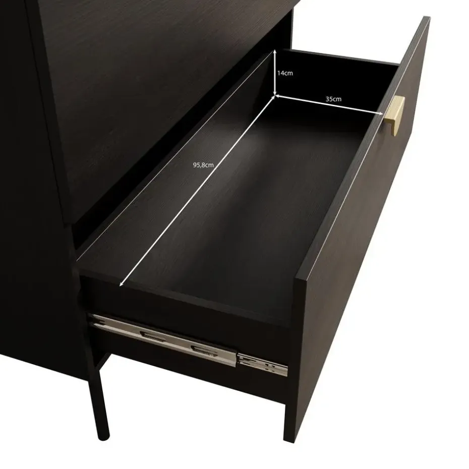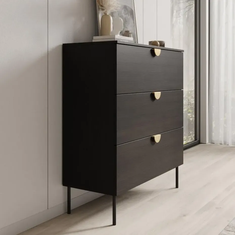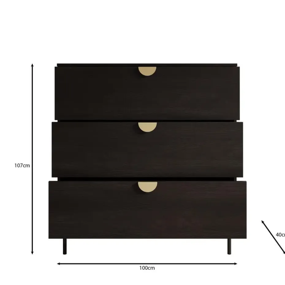Ladekast Monor beschikt over 3 lades die openen met goudkleurige handgrepen. De Monor heeft een modern, industriële uitstraling en is uitgevoerd in de kleur zwart eiken. Het meubel staat op metalen poten. Het meubel wordt ongemonteerd geleverd. Je dient het dus met behulp van de bijgeleverde handleiding zelf in elkaar te zetten.