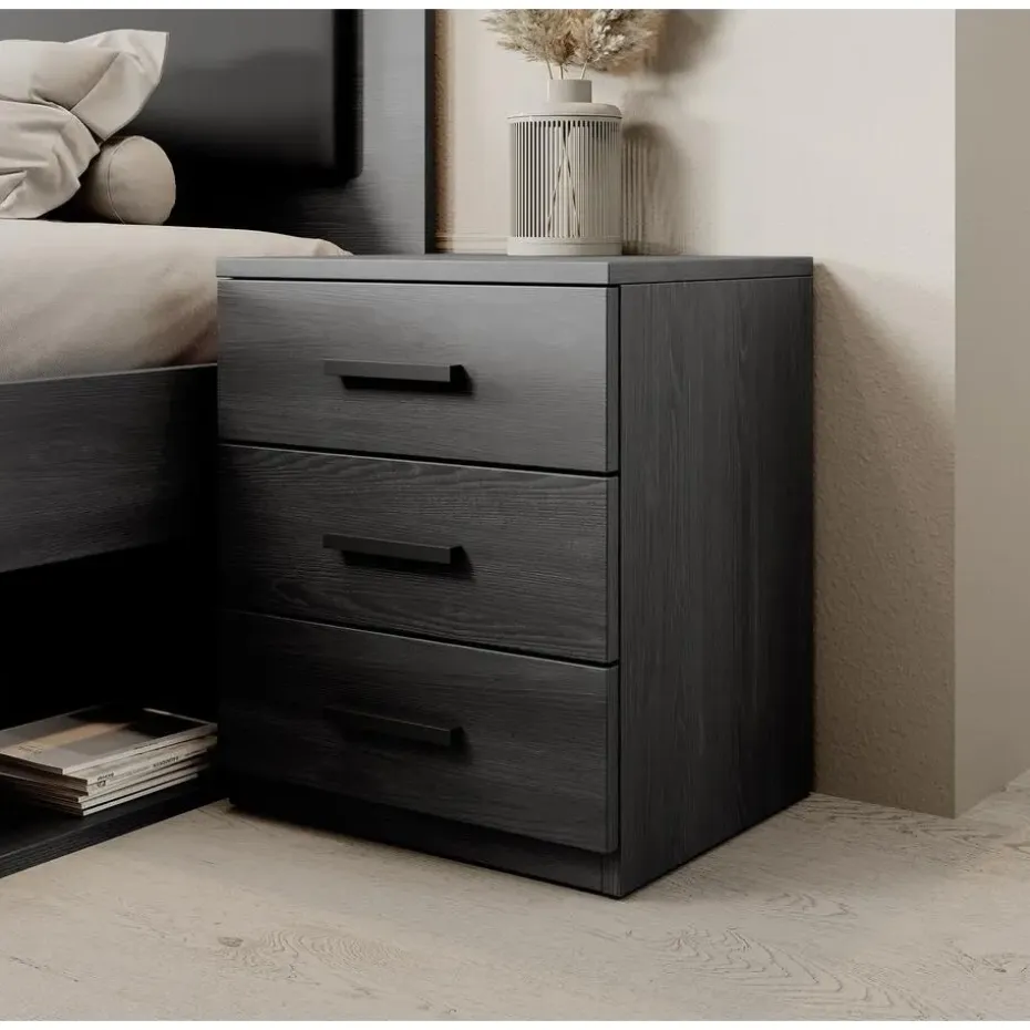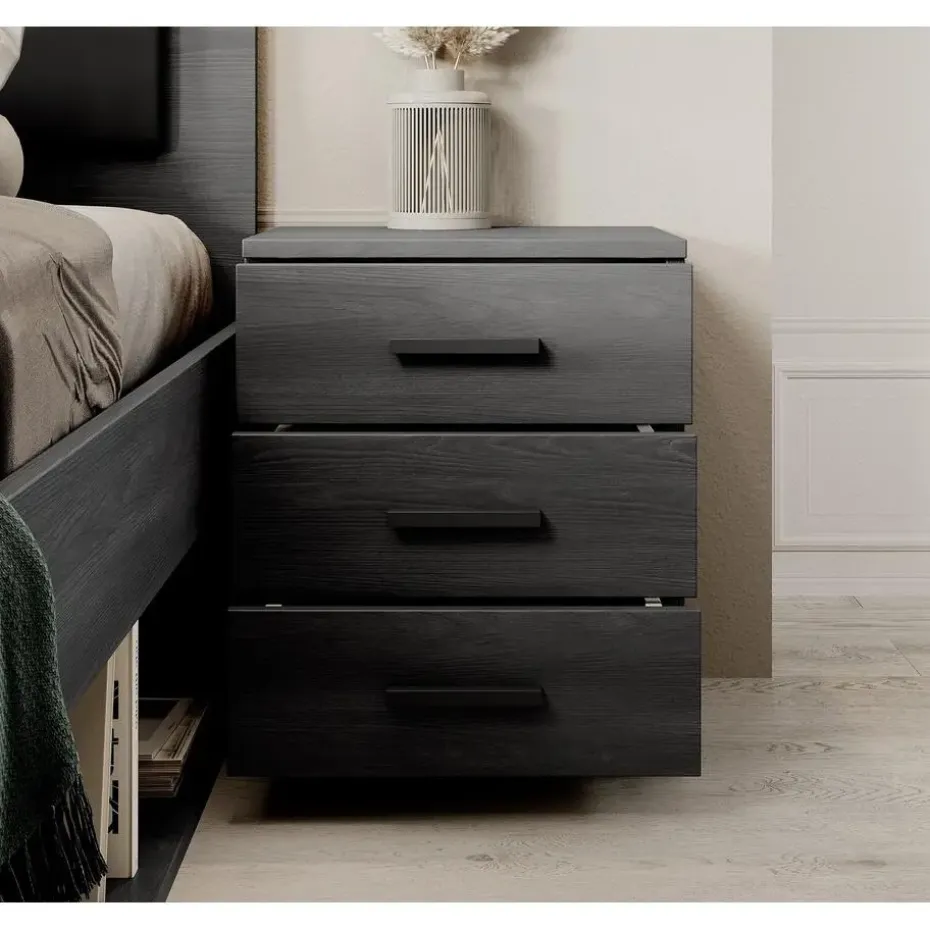 De Gina is een nachtkastje met een moderne uitstraling. Het kastje beschikt over 3 lades die te openen zijn met handgrepen. De Gina is gemaakt van een stevige spaanplaat constructie afgewerkt in een antraciet eiken kleur. Het meubel wordt ongemonteerd geleverd. Je dient het dus met behulp van de bijgeleverde handleiding zelf in elkaar te zetten.