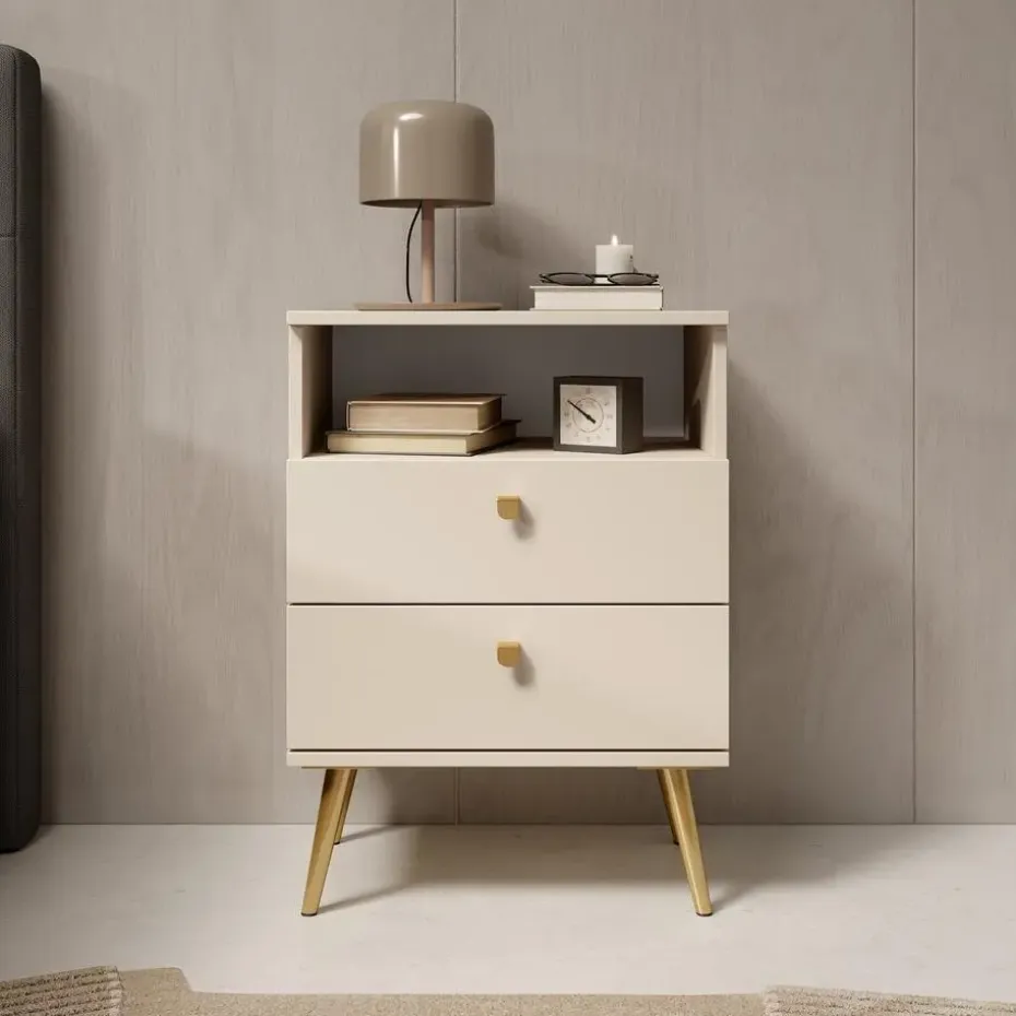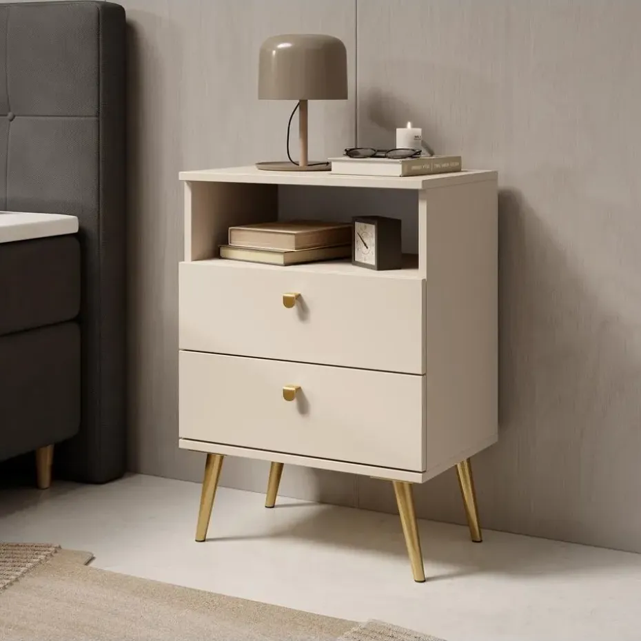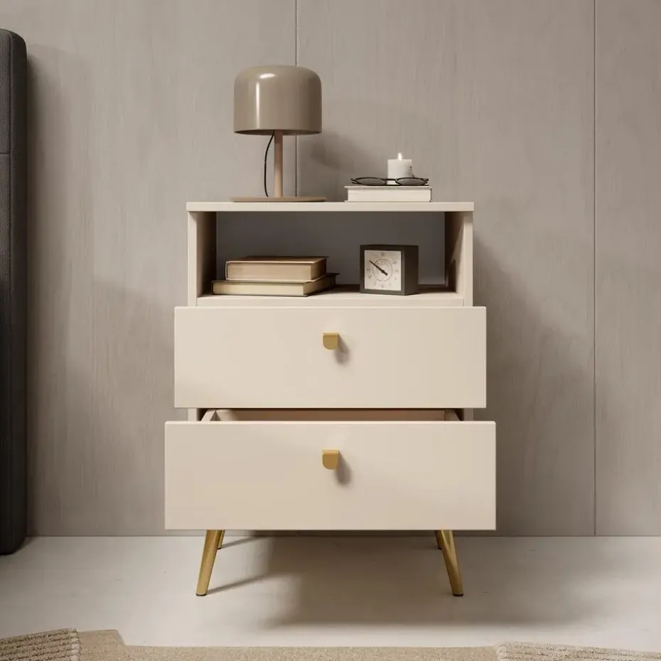 Nachtkastje Hidde heeft 2 lades en 1 open vak. De lades openen met een goudkleurige knop. Het nachtkastje staat op hoge, goudkleurige pootjes. Het meubel wordt ongemonteerd geleverd. Je dient het dus met behulp van de bijgeleverde handleiding zelf in elkaar te zetten.