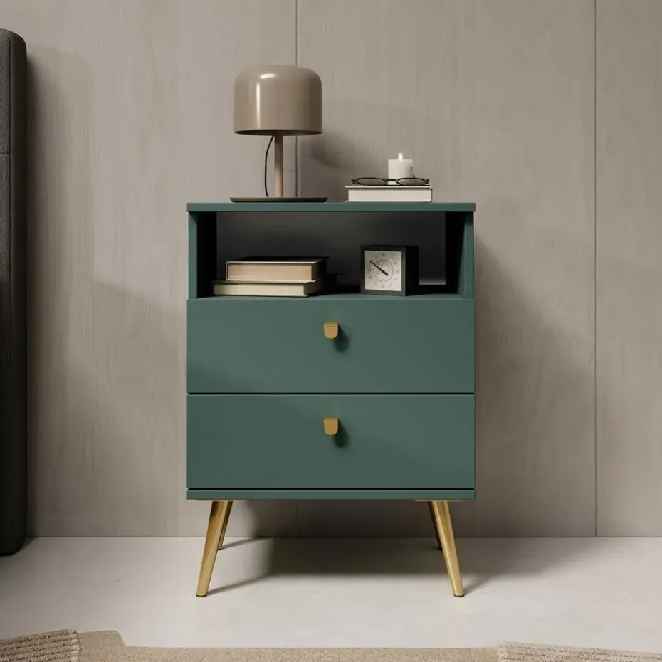 Nachtkastje Hidde heeft 2 lades en 1 open vak. De lades openen met een goudkleurige knop. Het nachtkastje staat op hoge, goudkleurige pootjes. Het meubel wordt ongemonteerd geleverd. Je dient het dus met behulp van de bijgeleverde handleiding zelf in elkaar te zetten.