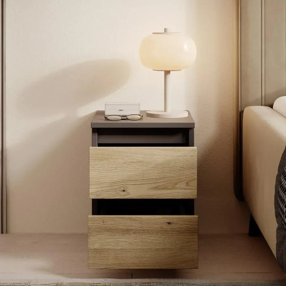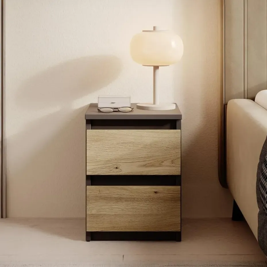 Nachtkastje Masuka beschikt over 2 lades. De lades zijn greeploos. Het kastje is uitgevoerd in antraciet met eiken kleur en heeft een moderne uitstraling. Het meubel wordt ongemonteerd geleverd. Je dient het dus met behulp van de bijgeleverde handleiding zelf in elkaar te zetten.