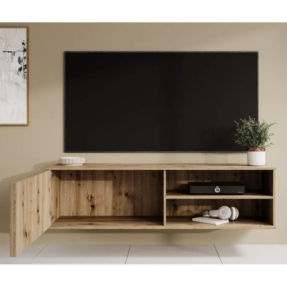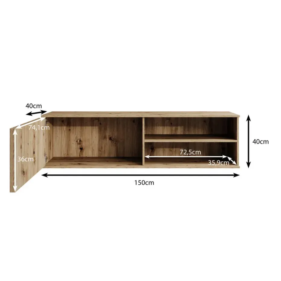 TV-Meubel Evy is gemaakt in eiken kleur. De TV kast heeft 2 open vakken en 1 deurtje die op de voorkant eiken latjes heeft. TV-Meubel Evy is een hangend model, dus je dient het aan de muur te bevestigen. Het meubel wordt ongemonteerd geleverd. Je dient het dus met behulp van de bijgeleverde handleiding zelf in elkaar te zetten.