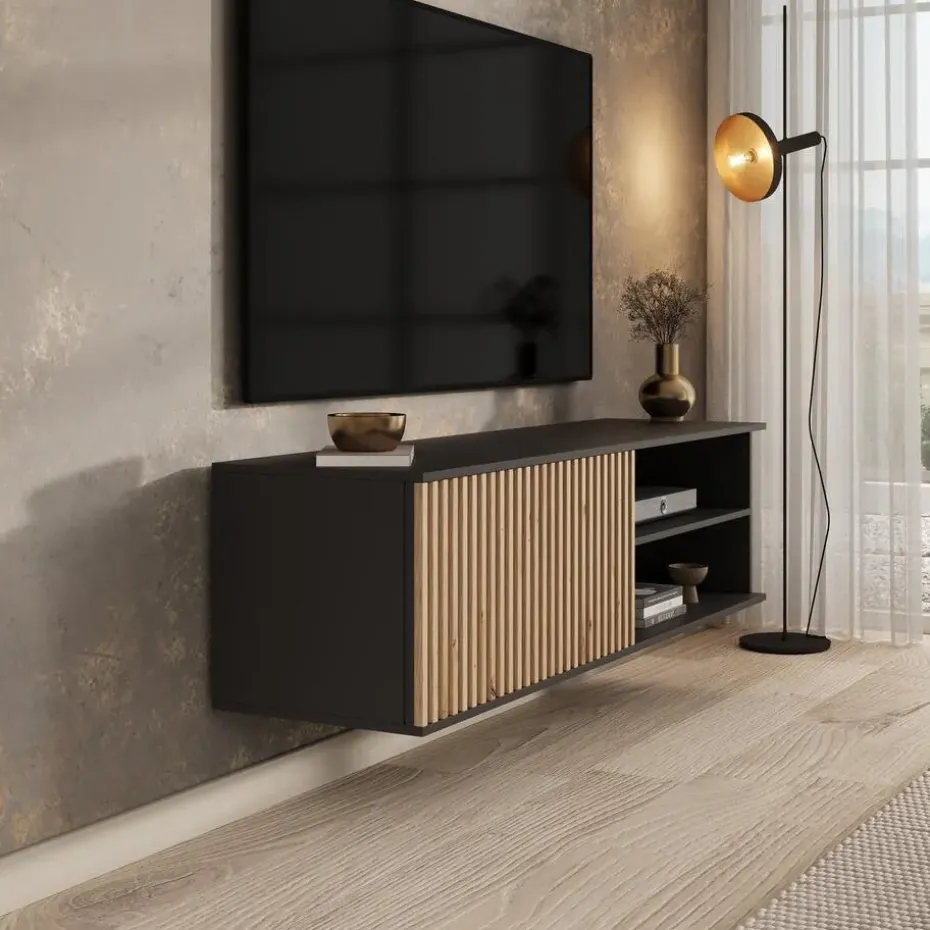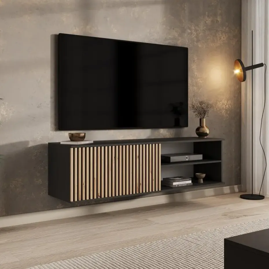 TV-Meubel Marbella is gemaakt in mat zwarte kleur. De TV kast heeft 2 open vakken en 1 deurtje die op de voorkant eiken latjes heeft. TV-Meubel Marbella is een hangend model, dus je dient het aan de muur te bevestigen. Het meubel wordt ongemonteerd geleverd. Je dient het dus met behulp van de bijgeleverde handleiding zelf in elkaar te zetten.