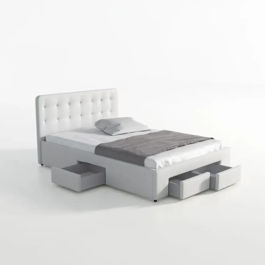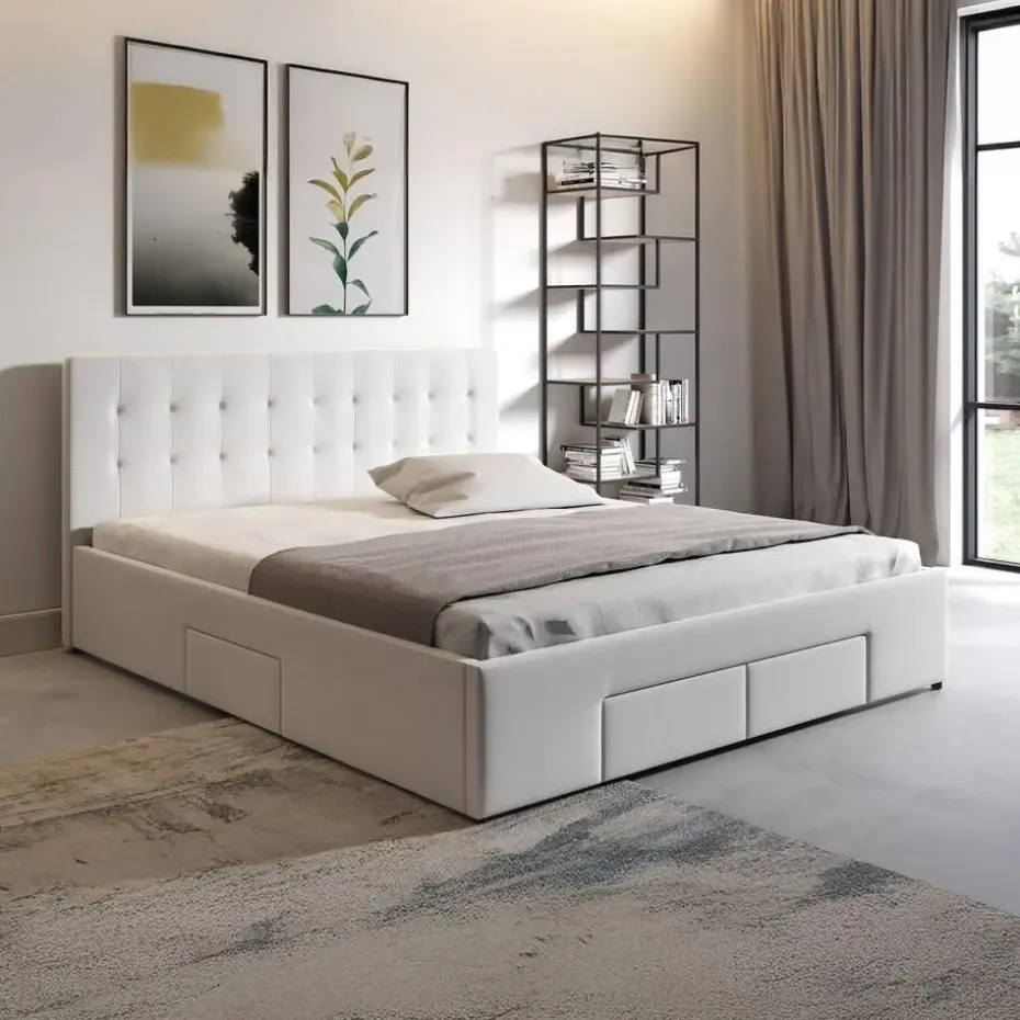 Tweepersoonsbed Milo is gemaakt van stevig kunstleer in witte kleur. Het bed wordt met lattenbodem geleverd en is geschikt voor matrasmaat 140×200 cm. In het voetenbord en de zijkanten zitten lades op wieltjes. Het meubel wordt ongemonteerd geleverd. Je dient het dus met behulp van de bijgeleverde handleiding zelf in elkaar te zetten.