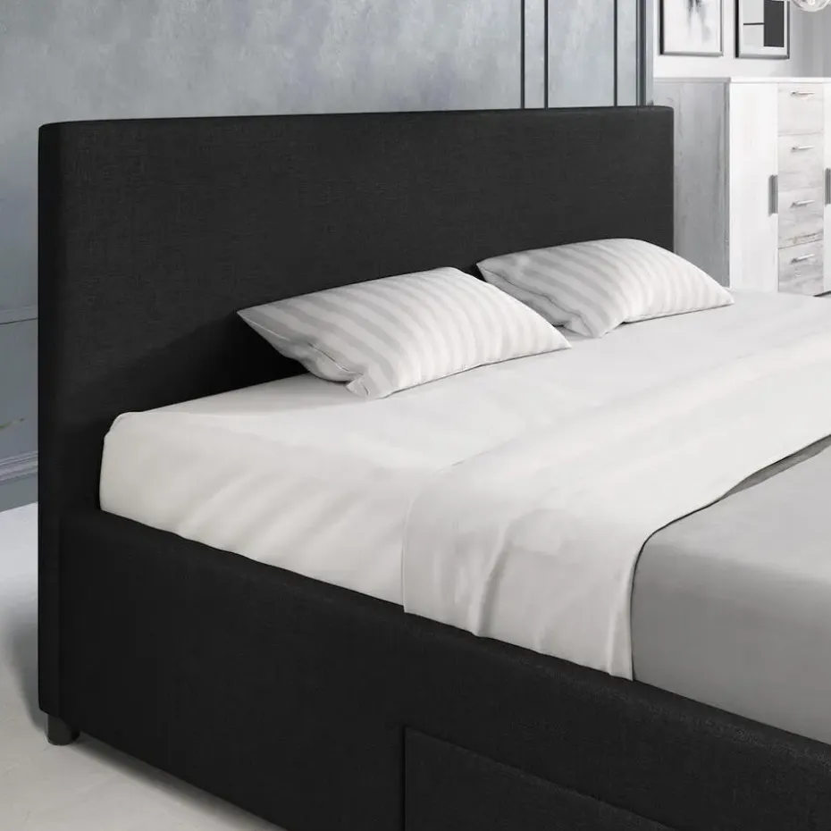 Tweepersoonsbed Suente is gemaakt van stof in zwarte kleur. Het bed wordt met lattenbodem geleverd en is geschikt voor matrasmaat 180x200cm. In het voetenbord en de zijkanten zitten lades op wieltjes. Het meubel wordt ongemonteerd geleverd. Je dient het dus met behulp van de bijgeleverde handleiding zelf in elkaar te zetten.