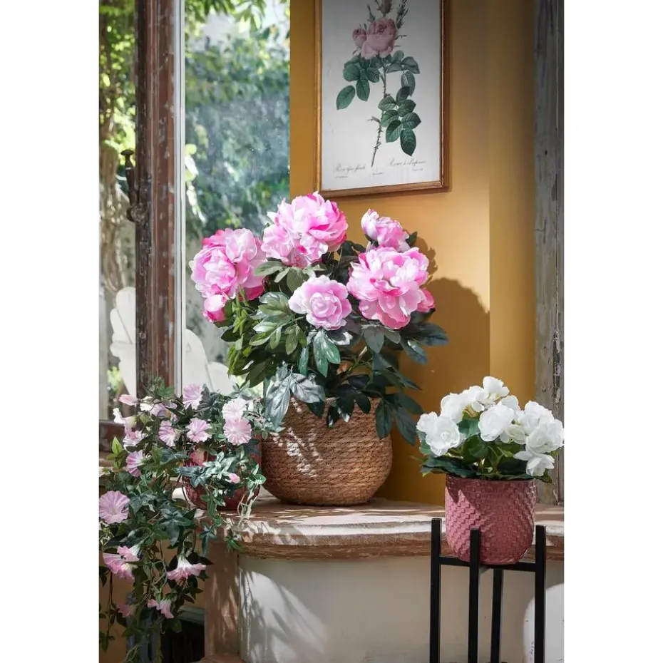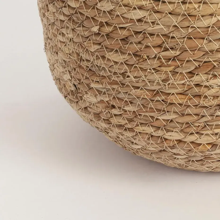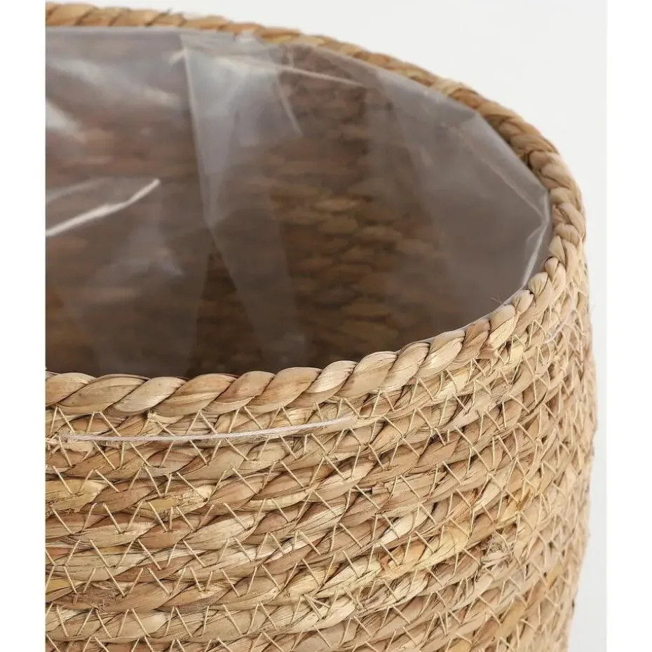 Naturel beige kleur rotan planten pot mand van gedraaid jute/touw/riet/zeegras van 24 cm hoogte en 26 cm diameter(buitenzijde). Voor de binnenmaat trek je 3 cm af. Mooie rotan jute manden/mandjes voor bloemen, bloemstukjes en planten met plastic aan de binnenkant zodat het water er niet door gaat. De ronde rieten mand heeft geen gaatjes aan de onderkant.