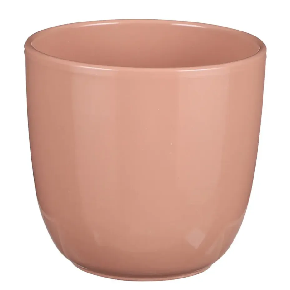 Plantenpot/bloempot van keramiek in de kleur Lichtroze in strakke glanzende uitvoering. Diameter 13.5 cm en hoogte 13 cm. Mooie bloempotten voor binnen gebruik. Serie: Tusca. De bloempot met een prachtige glans finish aan de buitenzijde is van Duits keramiek. Tip: zet een schotel onder de pot, of plaats een binnenpot/hoes om eventueel lekken tegen te gaan. Potten van gebakken steen zijn niet altijd 100% waterdicht.