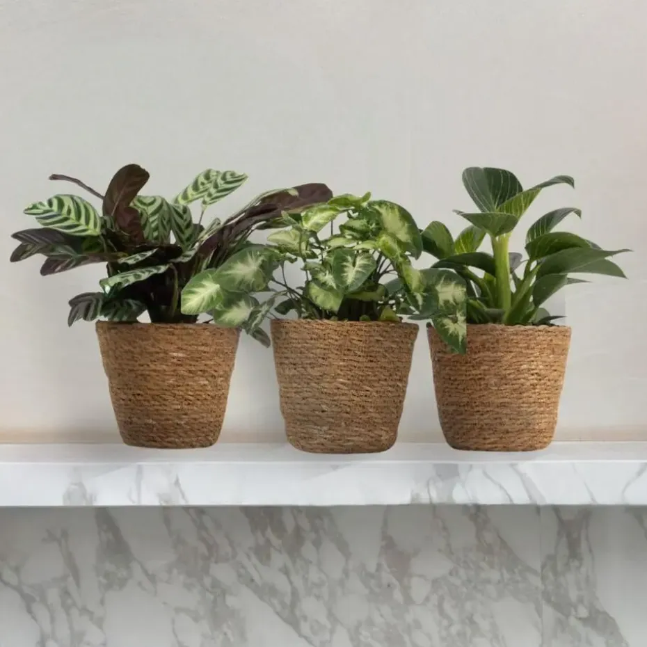 Ctenanthe Burle Marxii, Philodendron White Wave en Syngonium zijn tropische planten die gedijen in warme, vochtige omgevingen. Ze gedijen goed bij helder, indirect licht en moeten worden beschermd tegen direct zonlicht. Houd de grond vochtig maar niet doorweekt en zorg voor een hoge luchtvochtigheid door regelmatig te sproeien. Bemest tijdens het groeiseizoen en verminder de watergift in de winter. Verwijder regelmatig stof van de bladeren en controleer op plagen. Snoei dode of beschadigde bladeren voor een gezonde uitstraling en stimuleer nieuwe groei.