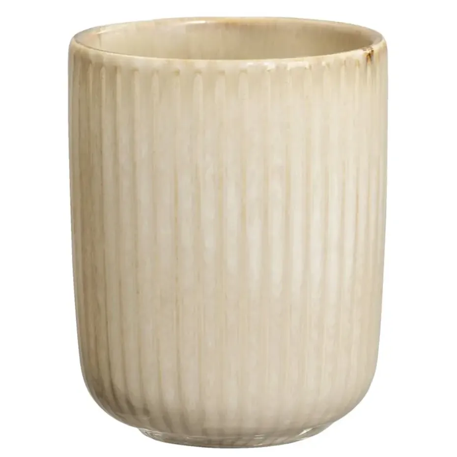 De beige Camille mok zonder oor is een grote mok met een inhoud van 300 ml, perfect als thee- of koffiemok. Gemaakt van stoneware, heeft deze mok een stijlvol ribbel patroon en een hoogglans afwerking. Maak jouw serviesset compleet met deze veelzijdige mok, die zowel magnetron- als vaatwasserbestendig is. Of je nu geniet van een ochtendkoffie of een avondthee, de Camille mok is een praktische en elegante keuze voor elke gelegenheid.
