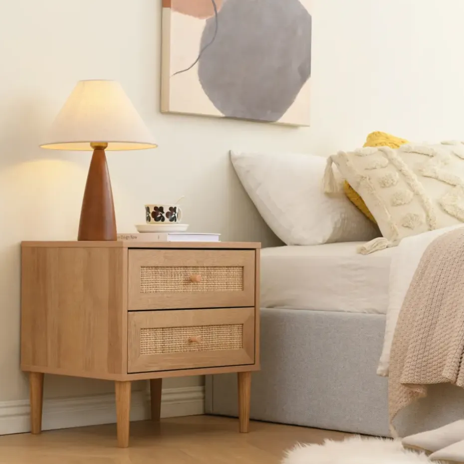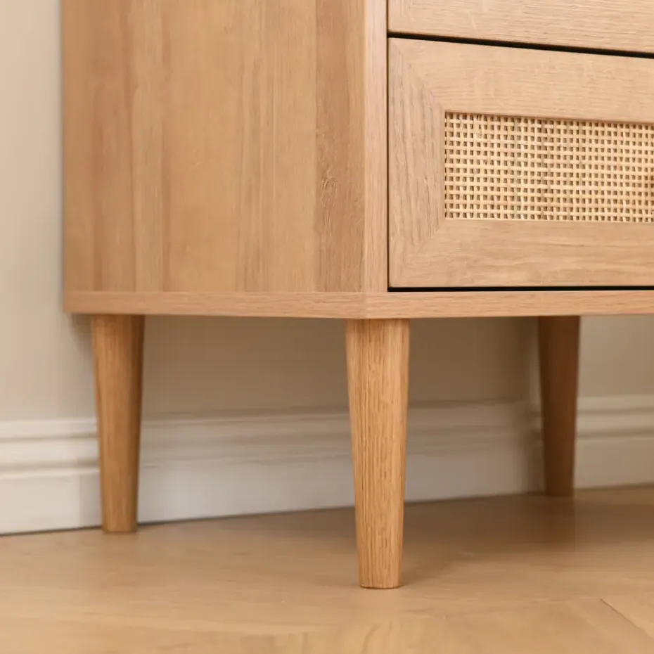 Breng stijl en functionaliteit in je slaapkamer met dit prachtige nachtkastje, gemaakt van stevig MDF en afgewerkt met een charmant rotan accent. De natuurlijke kleur en textuur van het rotan brengen een warme en gezellige sfeer in je kamer.