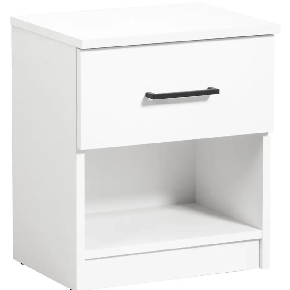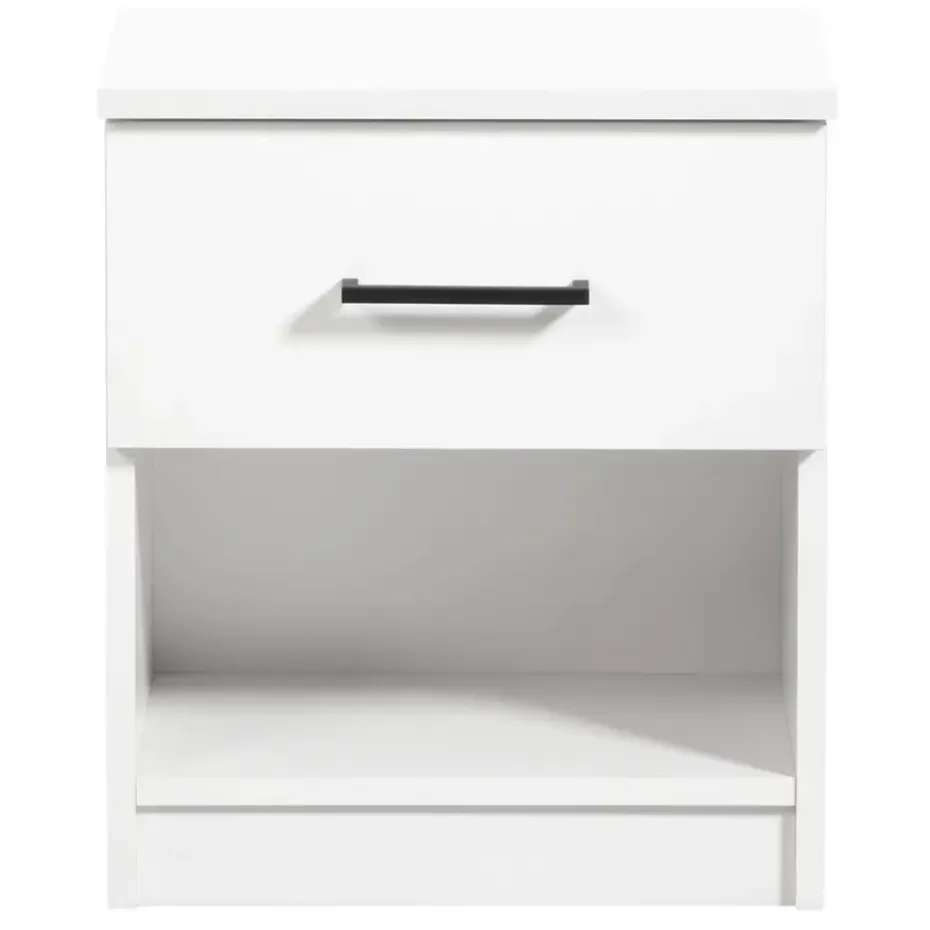 Nachtkastje Sena is een stijlvol en chique kastje voor in de slaapkamer. Dit kastje is wit van kleur en gemaakt van spaanplaat. De Sena heeft 1 lade met daaronder nog een open vak voor het opbergen van spullen. Bovenop kan een nachtlampje, wekker of andere accessoires worden gezet. De totale afmeting (hxbxd) van dit kastje is 47x41x32 cm.