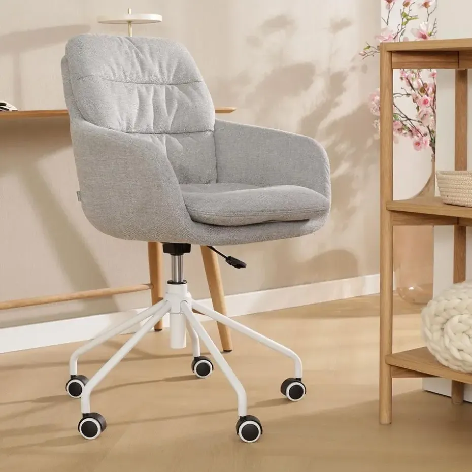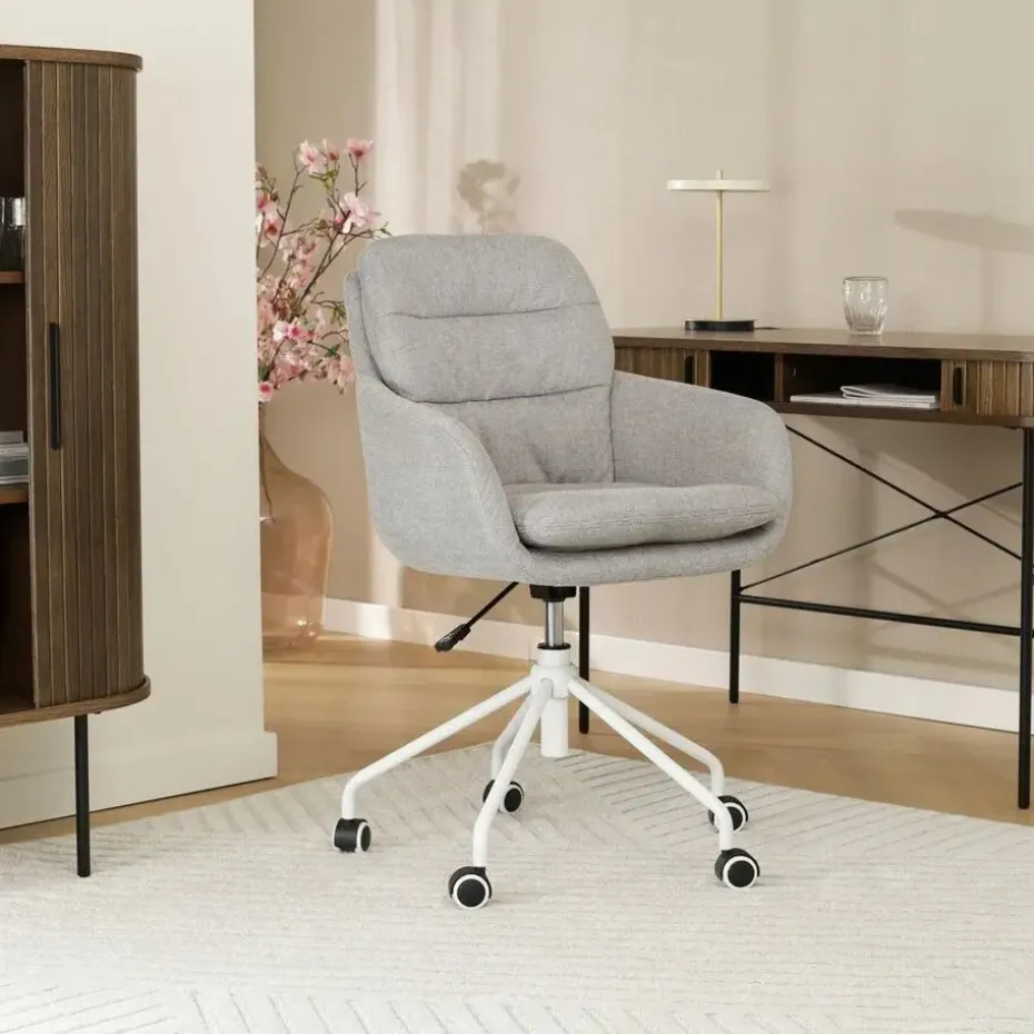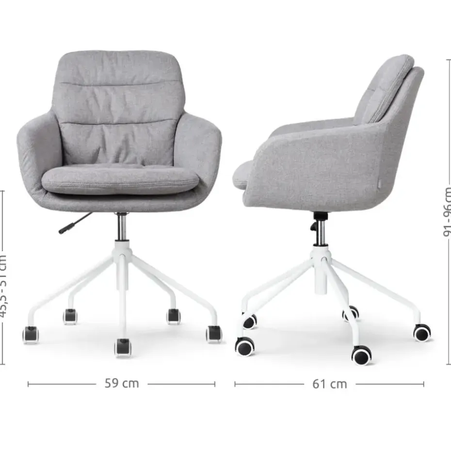 Een goede bureaustoel is enorm belangrijk, en met deze bureaustoel weet je zeker dat je comfortabel aan je bureau zit. De Nout-Mia bureaustoel is ontworpen met een comfortabele zitting met hoge rugleuning en armleuning. Dit zorgt voor de perfecte ondersteuning van het lichaam en voorkomt dat je last krijgt van de zitting. De zachte bekleding is gemaakt van hoogwaardige stof en is verkrijgbaar in twee kleuren. Het metalen onderstel van deze stoel is voorzien van vijf zwenkwielen en is bovendien draaibaar, waardoor je van een ultiem gevoel van flexibiliteit geniet. Stel de bureaustoel in op de juiste zithoogte en zorg ervoor dat je comfortabel aan het werk kunt op je thuiswerkplek.