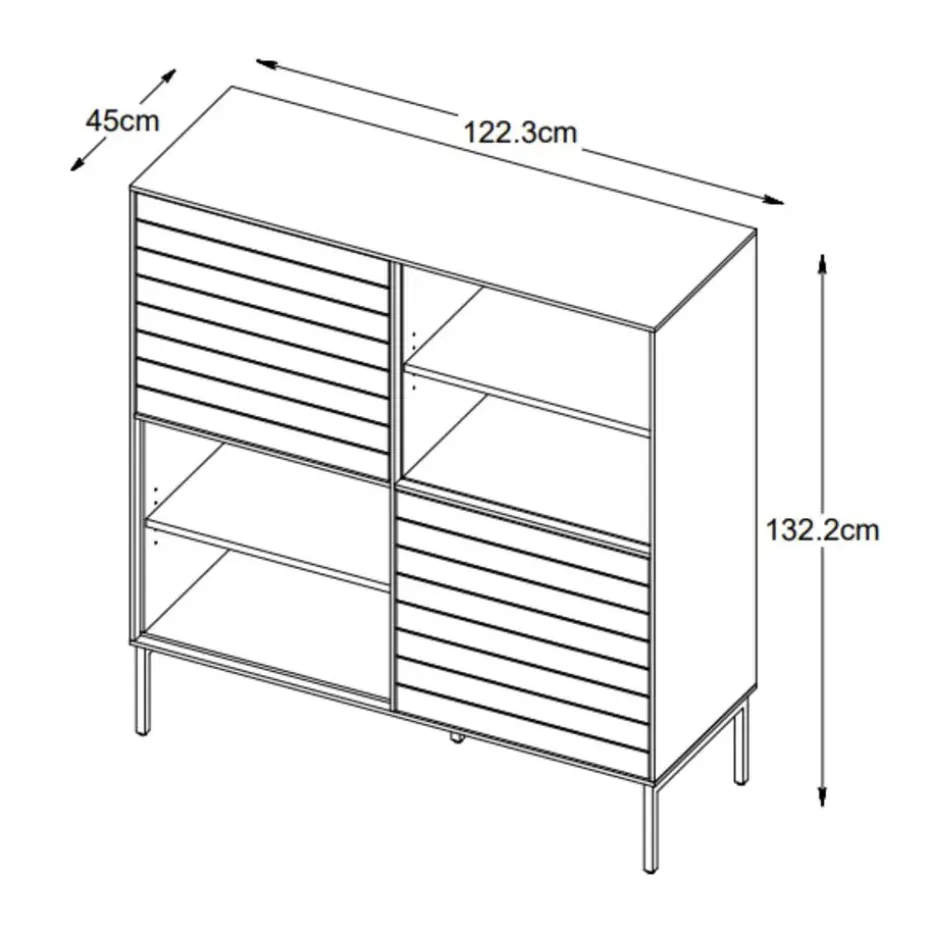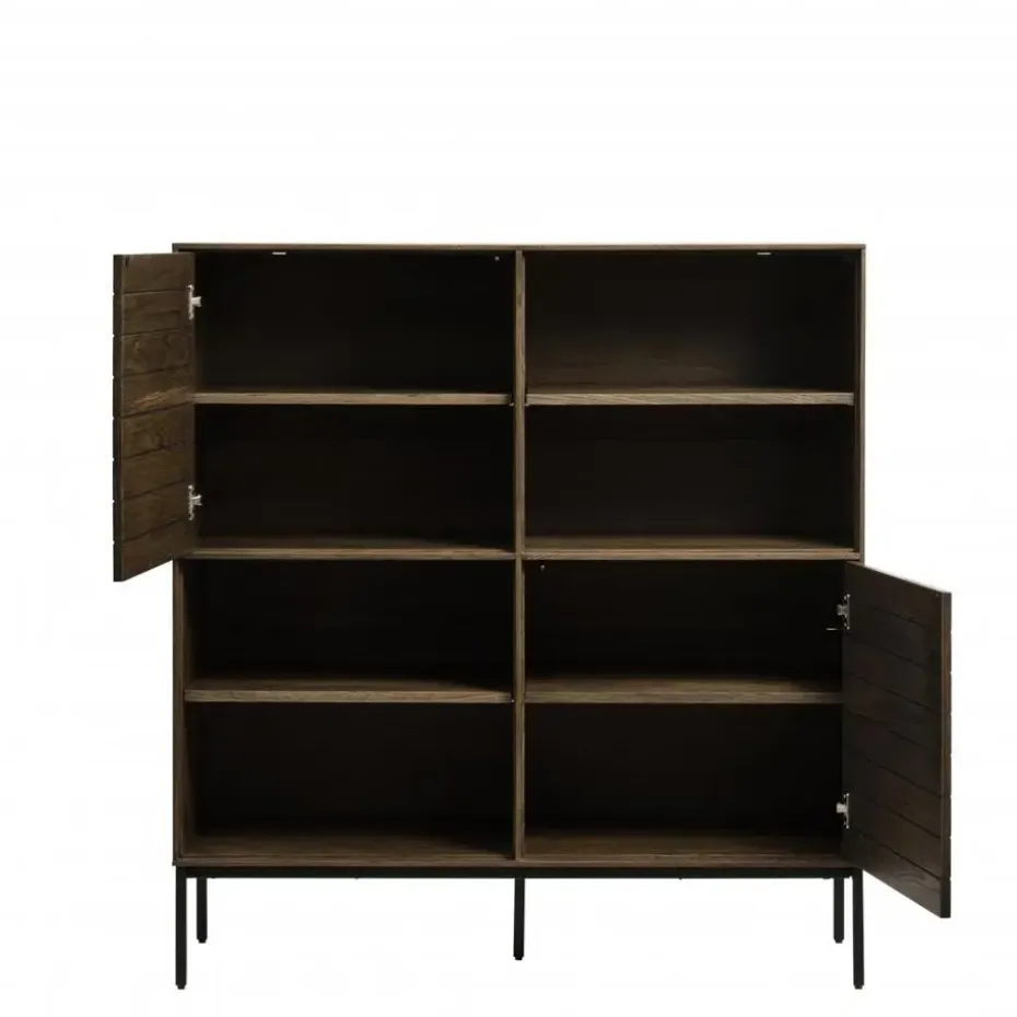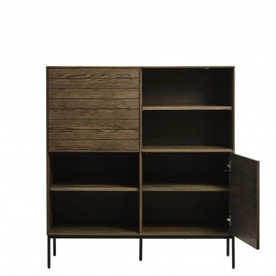 Een warm gerookt eikenhout dat mooi samenspeelt met uitgesneden horizontale rechte lijnen en industriële accenten van zwart metaal, geeft Alec een opvallende lichtheid, een ontwerp versterkt door de eenvoudige push-open deuren en laden.