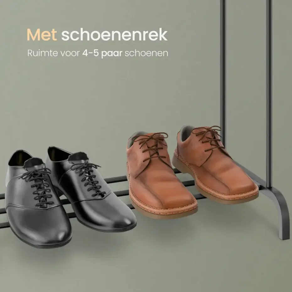 Het kledingrek beschikt over een handig schoenenrek aan de onderkant. Hier kun je gemakkelijk 4 tot 5 paar schoenen opbergen, waardoor je vloer netjes en opgeruimd blijft. Dit kledingrek dubbel maakt het mogelijk om al je favoriete items op één plek te bewaren, klaar om direct aan te trekken.