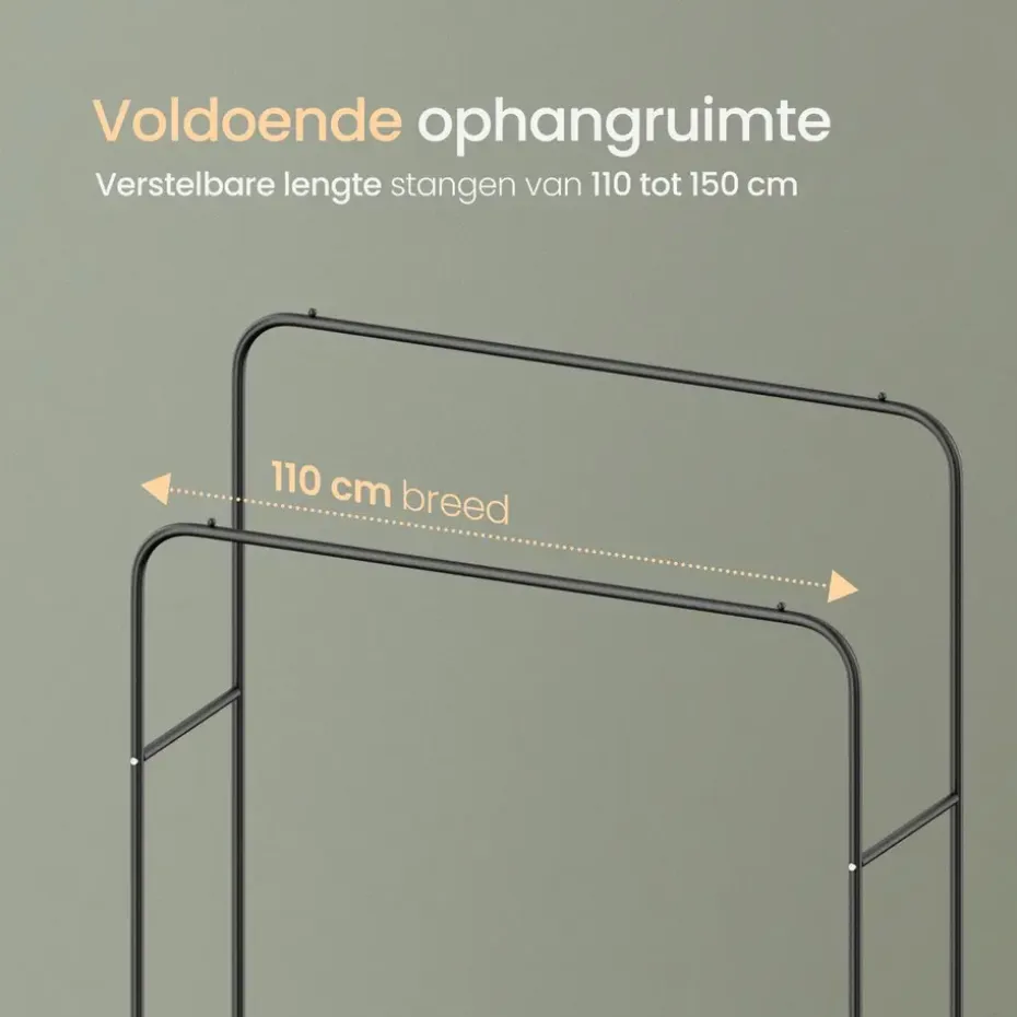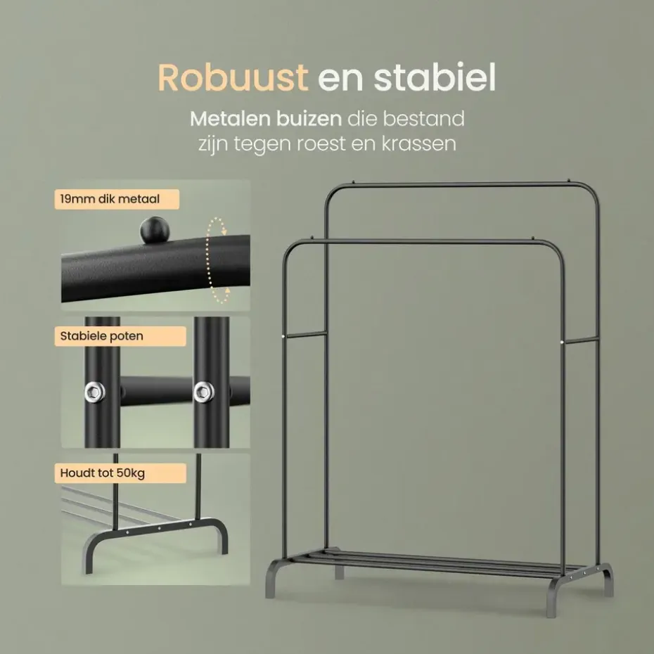 Stabiliteit is essentieel bij een kledingrek, en dat is precies wat dit product biedt. Het kledingrek is gemaakt van hoogwaardige, gepoedercoate metalen buizen met een dikte van 19 mm. Hierdoor staat ‘ie stevig op zijn plek. Met een draagvermogen van 50 kg, verdeeld over de twee stangen, kun je zonder zorgen al je kledingstukken ophangen. Ondanks de robuuste constructie is het rek licht van gewicht en gemakkelijk te verplaatsen.