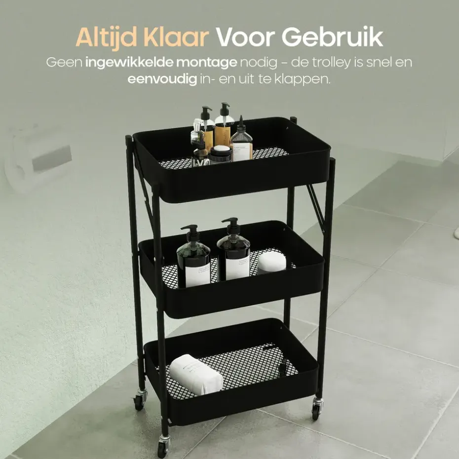 - Inklapbaar ontwerp: Bespaar ruimte door de trolley eenvoudig in te klappen en op te bergen wanneer hij niet nodig is.