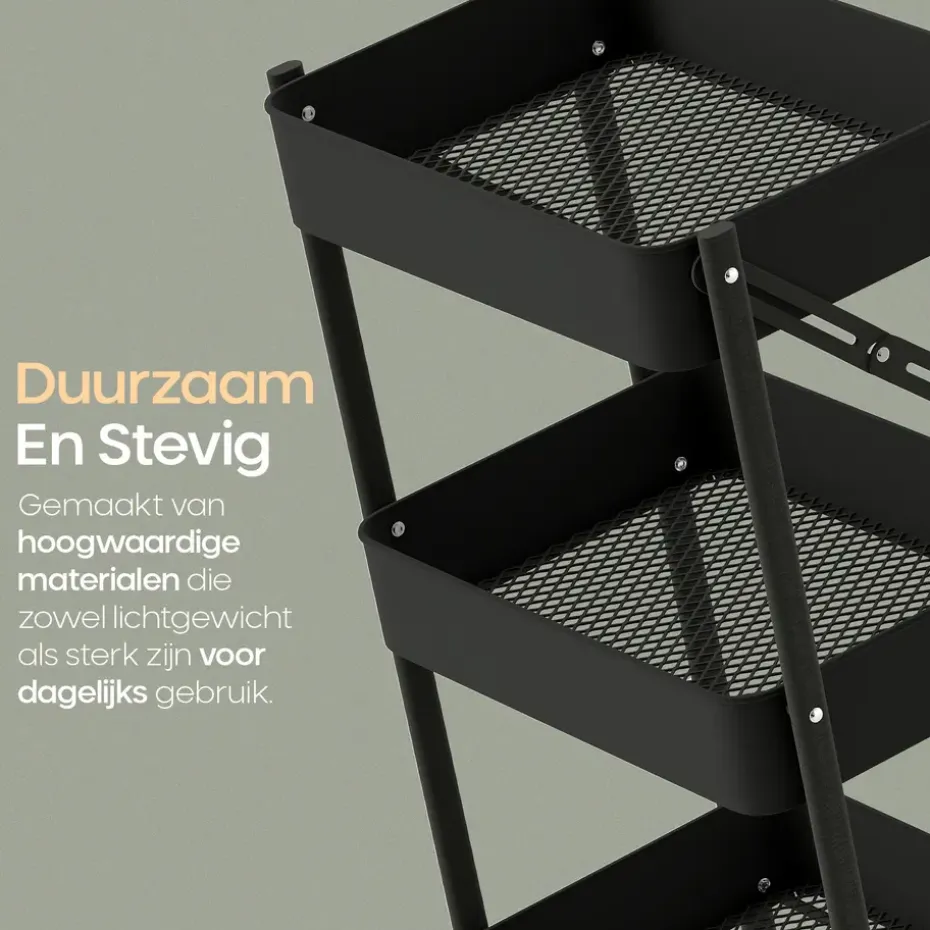 De O’DADDY® Keukentrolley is ontworpen met het oog op efficiëntie. Het inklapbare ontwerp maakt het mogelijk om de trolley snel op te bergen, ideaal voor kleinere keukens of wanneer extra ruimte gewenst is. Uitgeklapt biedt het een stabiel en ruim oppervlak voor al je keukenbenodigdheden.