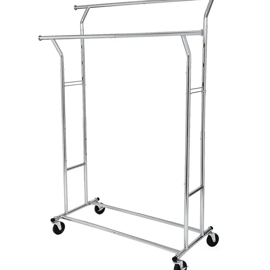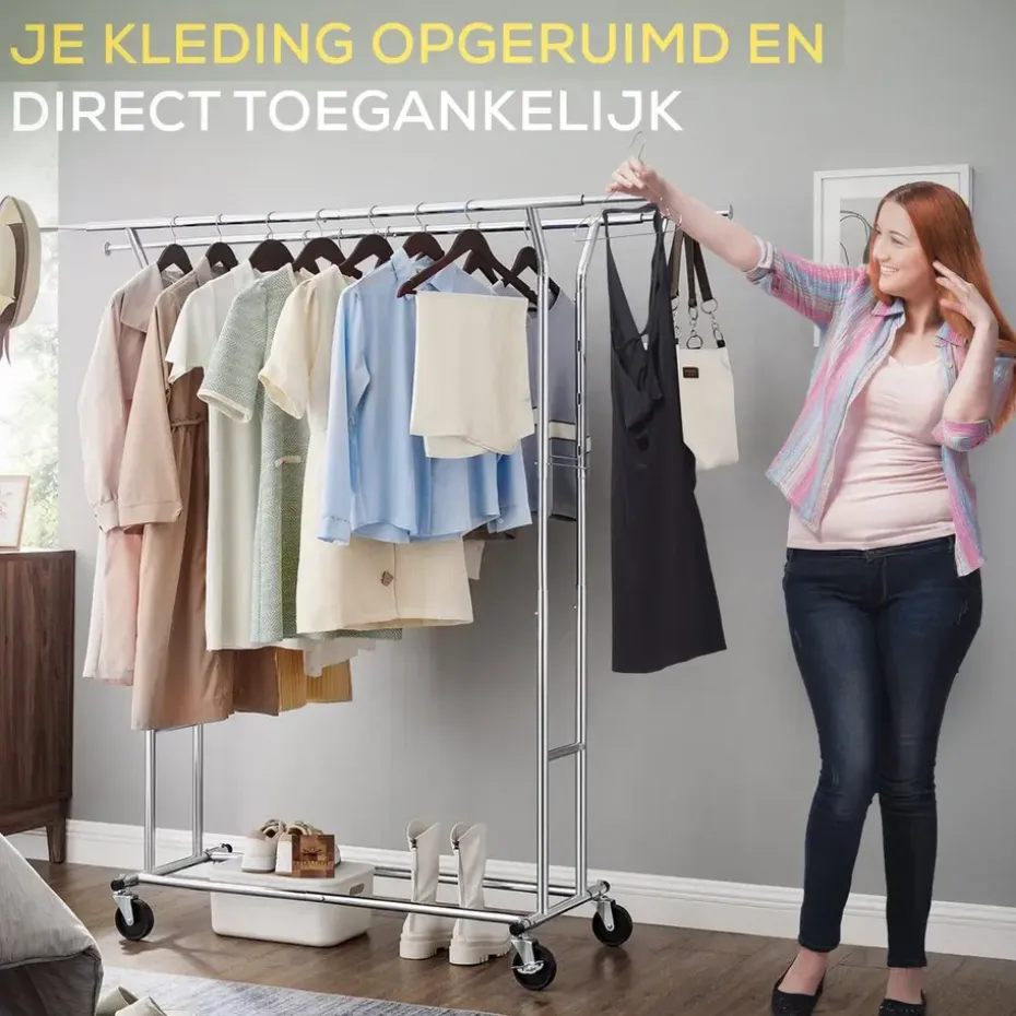 Dit kledingrek is uitgerust met vier robuuste zwenkwielen, waarvan twee met een remfunctie. Dit maakt het eenvoudig om het rek te verplaatsen, zelfs wanneer het volledig beladen is. Het rek is daarom perfect voor dynamische omgevingen zoals modeshows, kledingwinkels of dagelijks gebruik thuis. De onderste dwarsbalk biedt extra bergruimte voor schoenen of opbergdozen, wat het ordenen van ruimtes verder vergemakkelijkt.